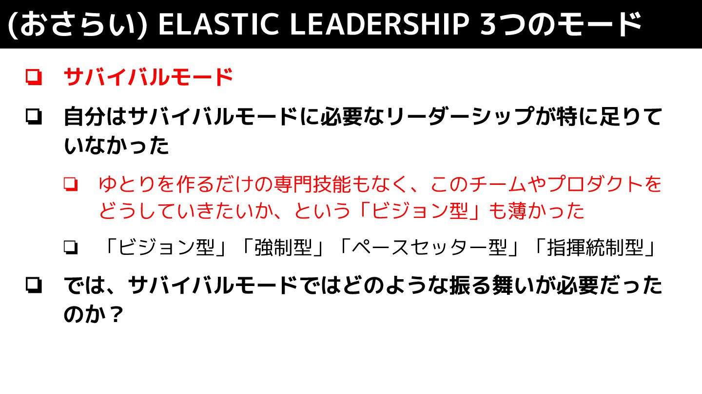 ❏ サバイバルモード ❏ 自分はサバイバルモードに必要なリーダーシップが特に足りて いなかった ❏ ゆとりを作るだけの専門技能もなく、このチームやプロダクトを どうしていきたいか、という「ビジョン型」も薄かった ❏ 「ビジョン型」「強制型」「ペースセッター型」「指揮統制型」