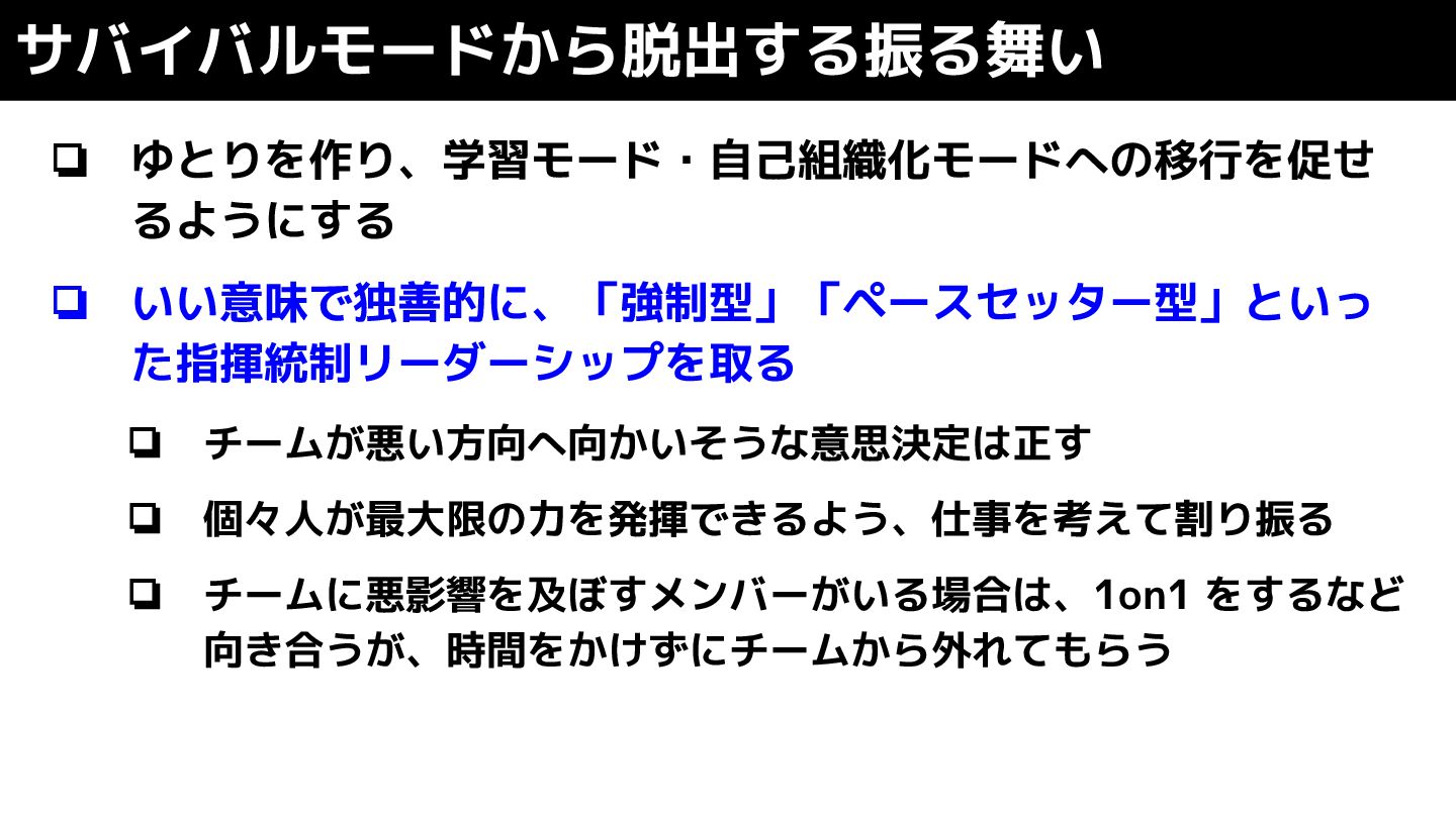 ❏ ゆとりを作り、学習モード・自己組織化モードへの移行を促せ るようにする ❏ いい意味で独善的に、「強制型」「ペースセッター型」といっ た指揮統制リーダーシップを取る ❏ チームが悪い方向へ向かいそうな意思決定は正す ❏ 個々人が最大限の力を発揮できるよう、仕事を考えて割り振る
