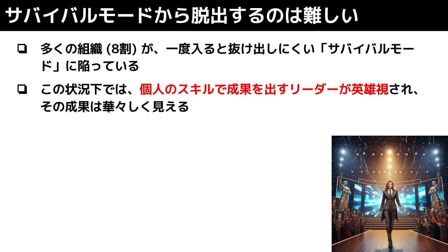 ❏ 多くの組織 (8割) が、一度入ると抜け出しにくい「サバイバルモー ド」に陥っている ❏ この状況下では、個人のスキルで成果を出すリーダーが英雄視され、 その成果は華々しく見える サバイバルモードから脱出するのは難しい