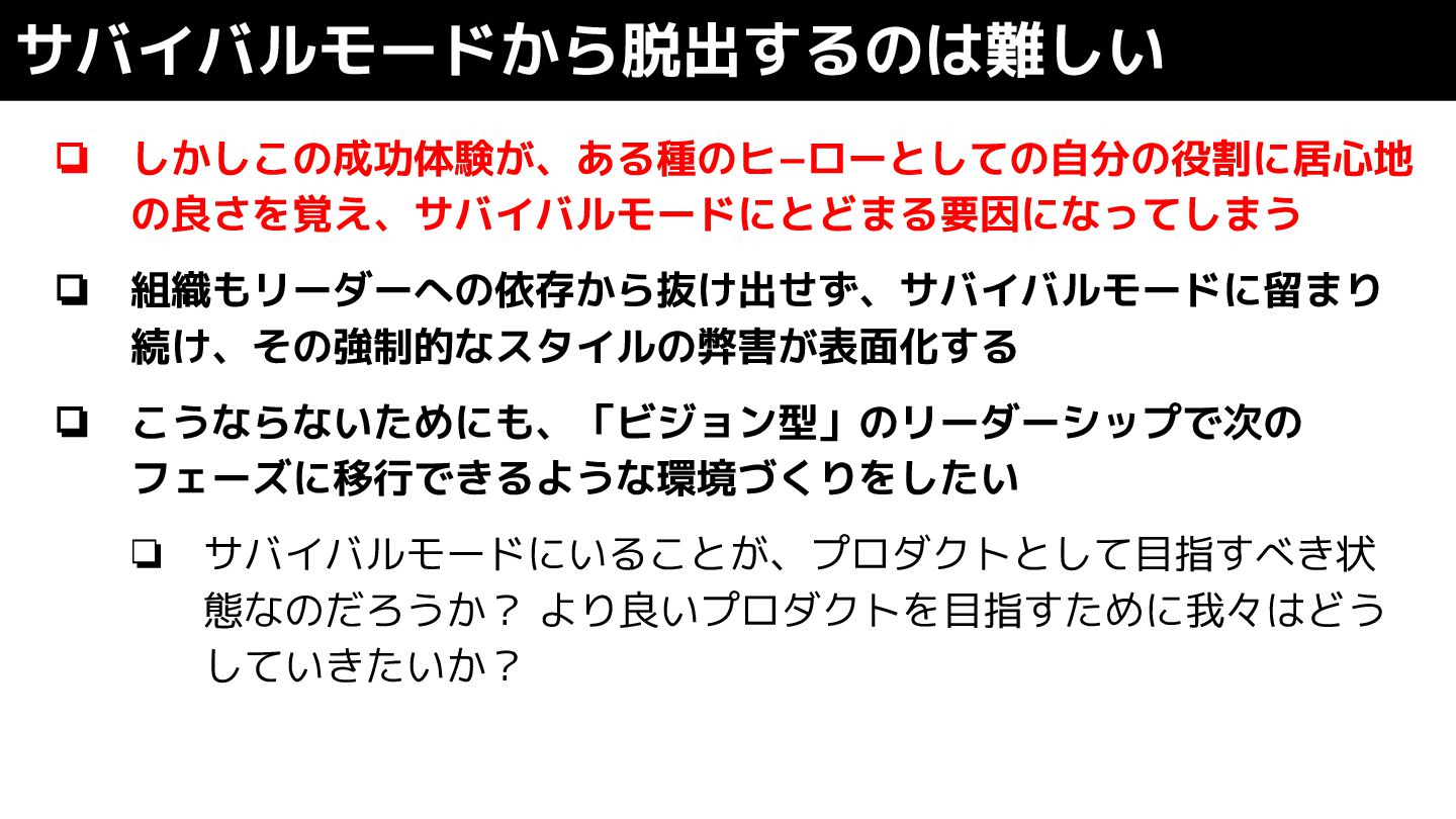❏ しかしこの成功体験が、ある種のヒ−ローとしての自分の役割に居心地 の良さを覚え、サバイバルモードにとどまる要因になってしまう ❏ 組織もリーダーへの依存から抜け出せず、サバイバルモードに留まり 続け、その強制的なスタイルの弊害が表面化する ❏ こうならないためにも、「ビジョン型」のリーダーシップで次の フェーズに移行できるような環境づくりをしたい ❏