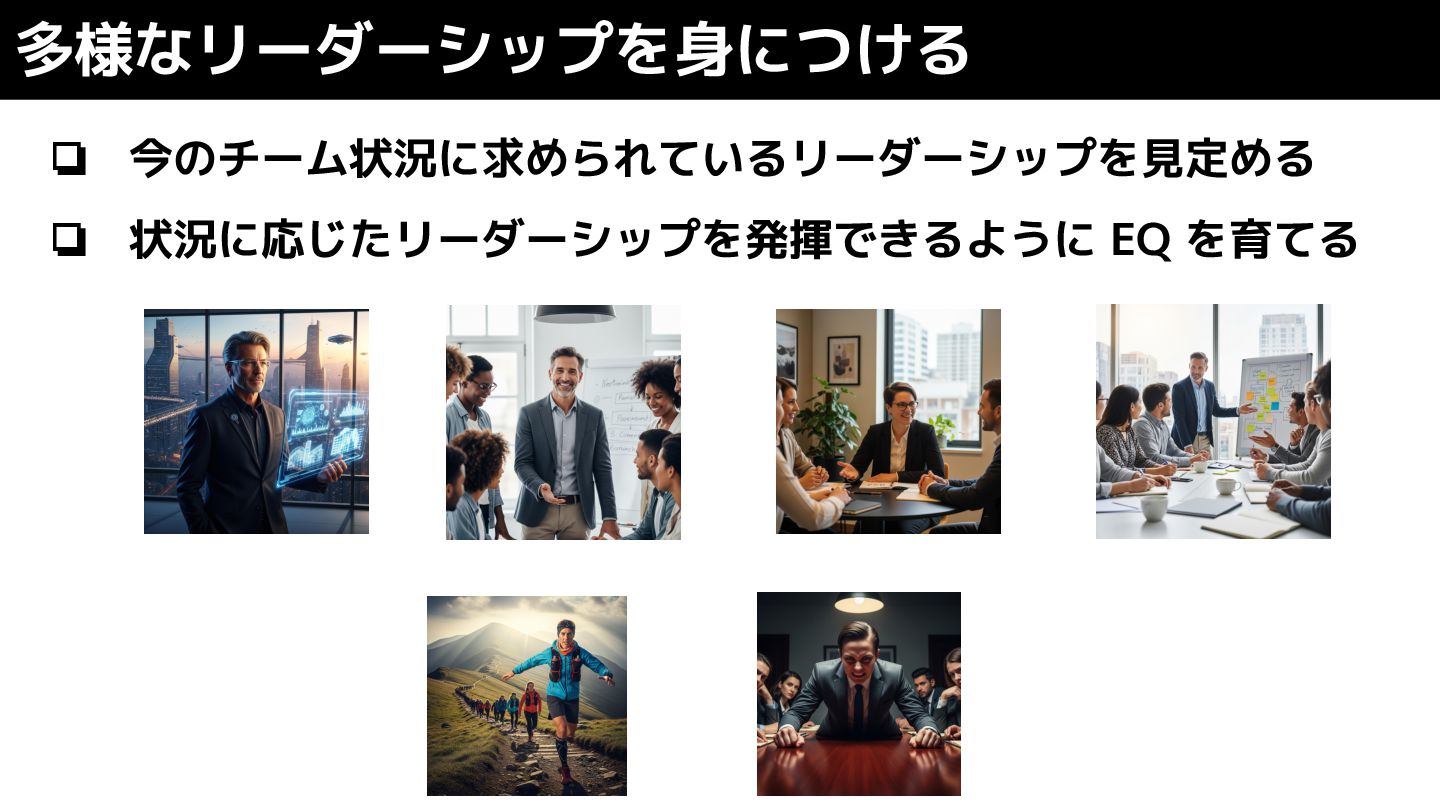❏ 今のチーム状況に求められているリーダーシップを見定める ❏ 状況に応じたリーダーシップを発揮できるように EQ を育てる 多様なリーダーシップを身につける