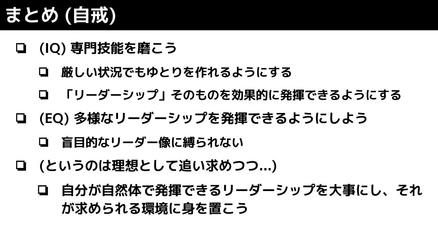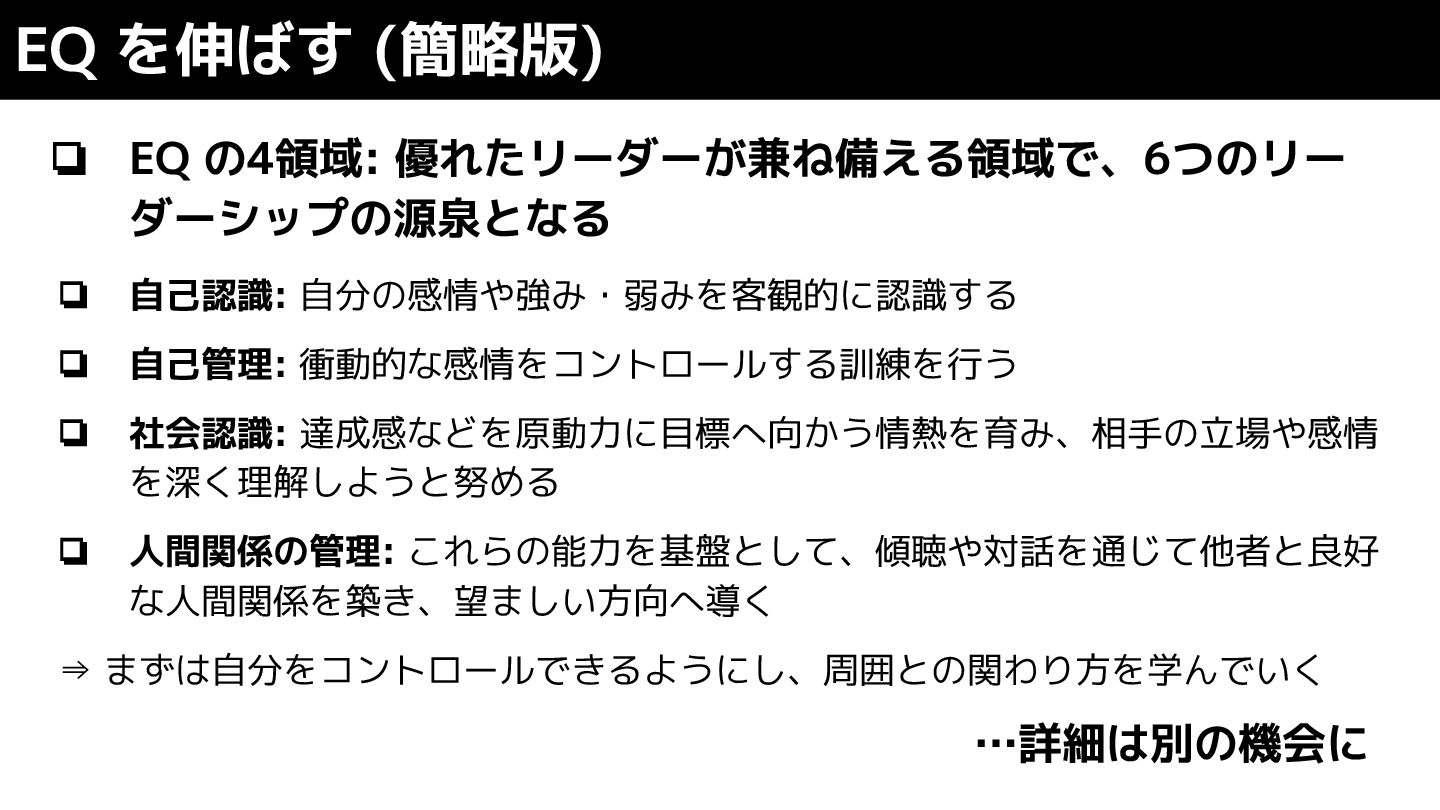 ❏ (IQ) 専門技能を磨こう ❏ 厳しい状況でもゆとりを作れるようにする ❏ 「リーダーシップ」そのものを効果的に発揮できるようにする ❏ (EQ) 多様なリーダーシップを発揮できるようにしよう