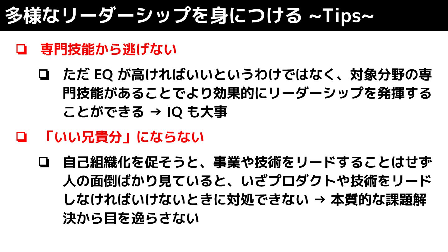 も大事 ❏ 「いい兄貴分」にならない ❏ 自己組織化を促そうと、事業や技術をリードすることはせず 人の面倒ばかり見ていると、いざプロダクトや技術をリード しなければいけないときに対処できない → 本質的な課題解 決から目を逸らさない 多様なリーダーシップを身につける ~Tips~