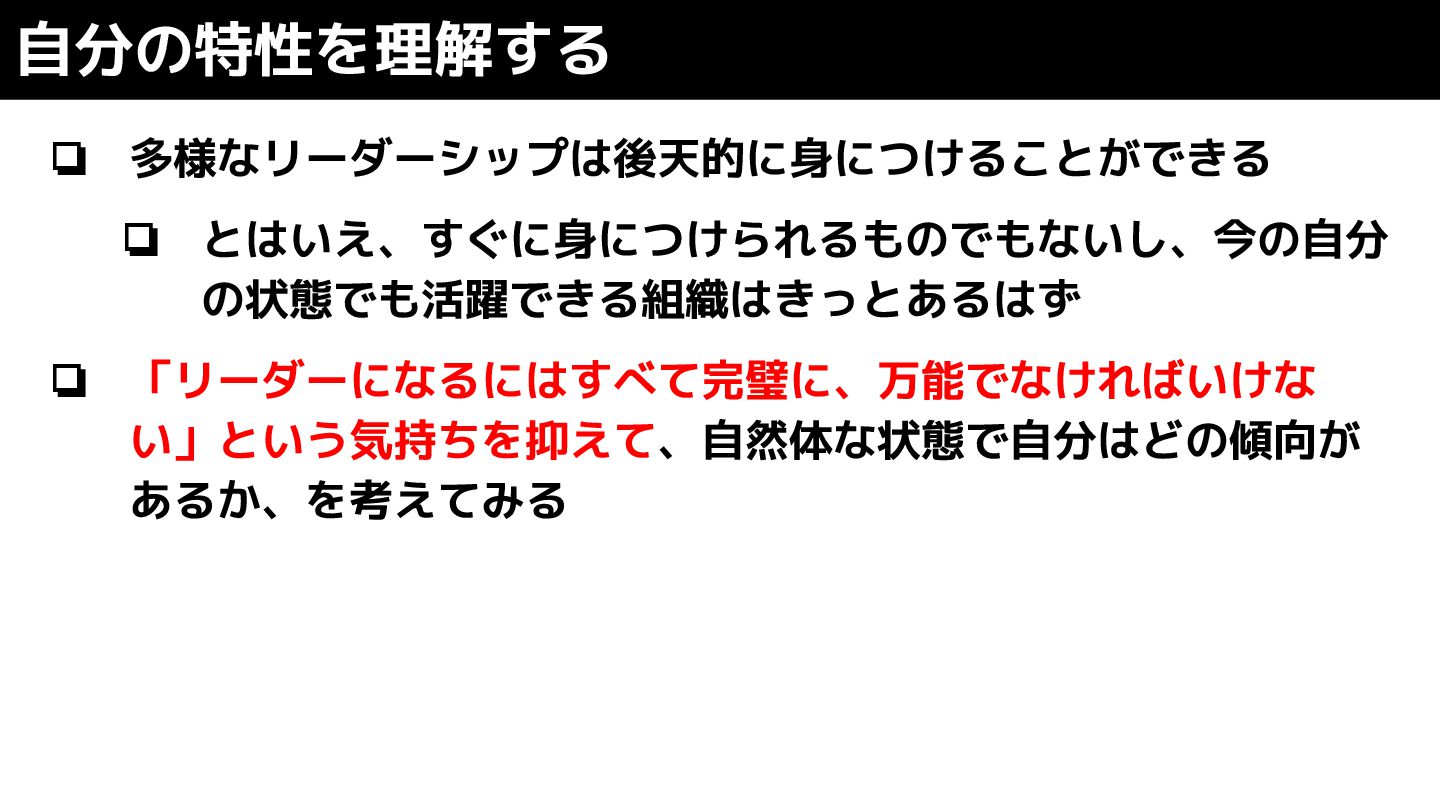 ❏ 多様なリーダーシップは後天的に身につけることができる ❏ とはいえ、すぐに身につけられるものでもないし、今の自分 の状態でも活躍できる組織はきっとあるはず ❏ 「リーダーになるにはすべて完璧に、万能でなければいけな い」という気持ちを抑えて、自然体な状態で自分はどの傾向が あるか、を考えてみる 自分の特性を理解する
