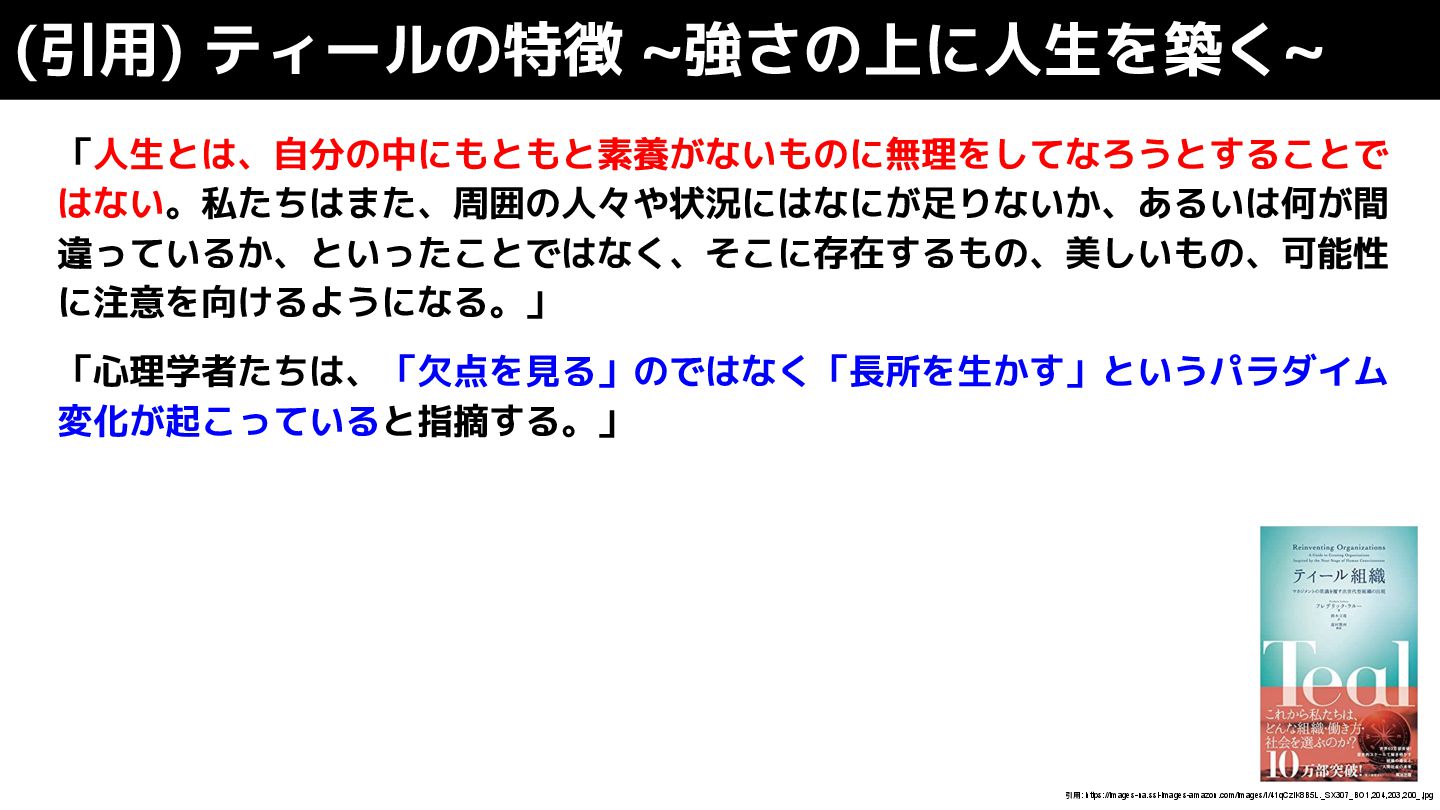 (引用) ティールの特徴 ~強さの上に人生を築く~ 引用: https://images-na.ssl-images-amazon.com/images/I/41qCziK8B5L._SX307_BO1,204,203,200_.jpg 「人生とは、自分の中にもともと素養がないものに無理をしてなろうとすることで はない。私たちはまた、周囲の人々や状況にはなにが足りないか、あるいは何が間 違っているか、といったことではなく、そこに存在するもの、美しいもの、可能性 に注意を向けるようになる。」 「心理学者たちは、「欠点を見る」のではなく「長所を生かす」というパラダイム