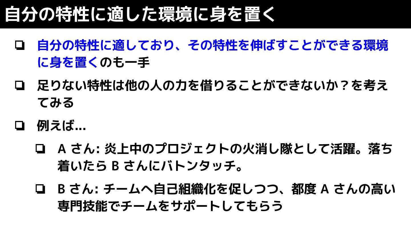 ❏ 自分の特性に適しており、その特性を伸ばすことができる環境 に身を置くのも一手 ❏ 足りない特性は他の人の力を借りることができないか?を考え てみる ❏ 例えば... ❏ A