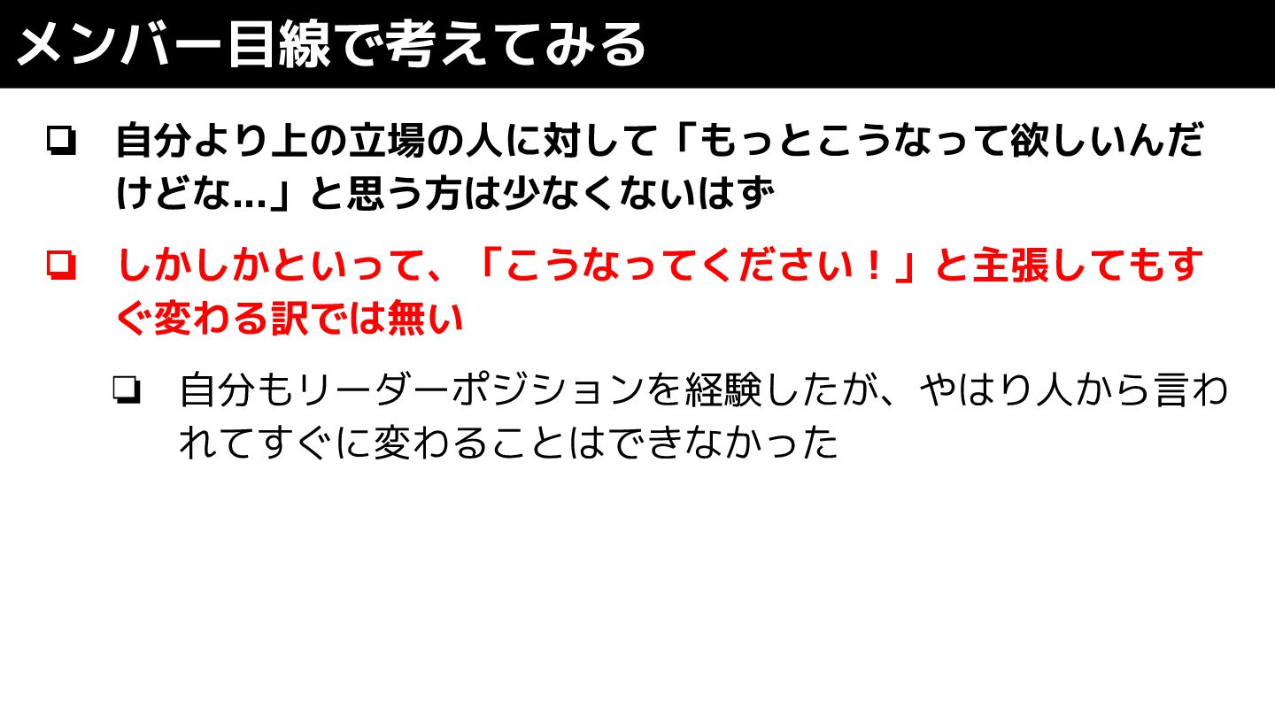 ❏ 自分より上の立場の人に対して「もっとこうなって欲しいんだ けどな...」と思う方は少なくないはず ❏ しかしかといって、「こうなってください!」と主張してもす ぐ変わる訳では無い ❏ 自分もリーダーポジションを経験したが、やはり人から言わ れてすぐに変わることはできなかった メンバー目線で考えてみる