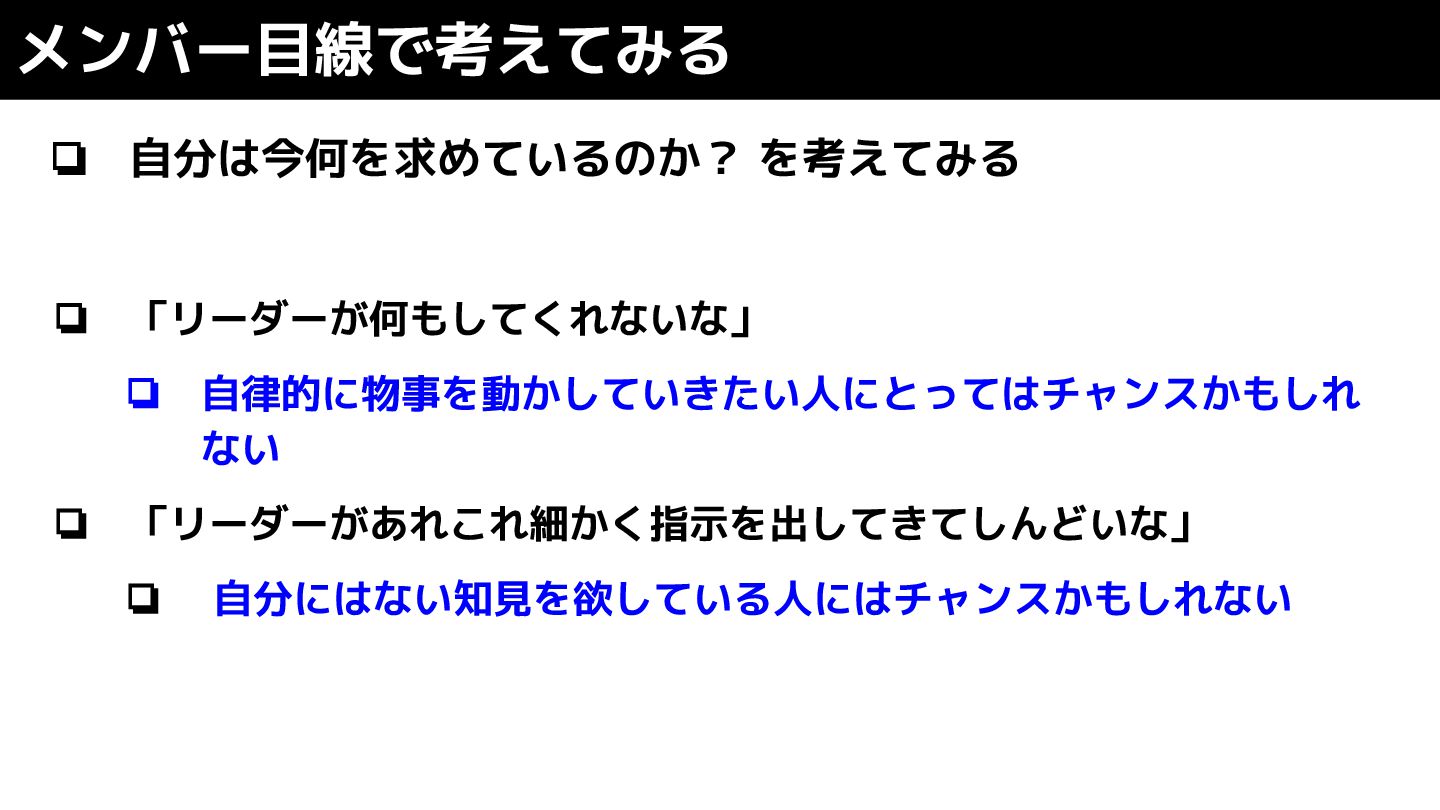 ❏ 自分は今何を求めているのか? を考えてみる ❏ 「リーダーが何もしてくれないな」 ❏ 自律的に物事を動かしていきたい人にとってはチャンスかもしれ ない ❏ 「リーダーがあれこれ細かく指示を出してきてしんどいな」