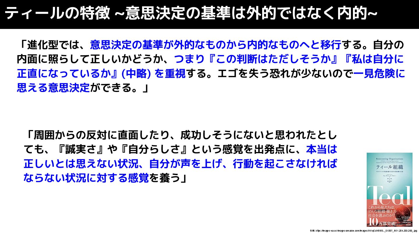 ティールの特徴 ~意思決定の基準は外的ではなく内的~ 引用: https://images-na.ssl-images-amazon.com/images/I/41qCziK8B5L._SX307_BO1,204,203,200_.jpg 「進化型では、意思決定の基準が外的なものから内的なものへと移行する。自分の 内面に照らして正しいかどうか、つまり『この判断はただしそうか』『私は自分に 正直になっているか』(中略) を重視する。エゴを失う恐れが少ないので一見危険に 思える意思決定ができる。」 「周囲からの反対に直面したり、成功しそうにないと思われたとし