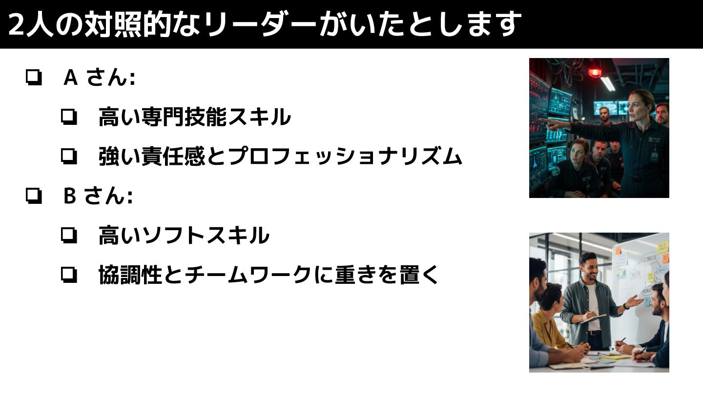 しまう ❏ B さん: ❏ チームがより良い状態になりたいというときには頼れる存在 ❏ 厳しいプロダクト状況ではいる意味があまりない存在 リーダーシップの向き不向き