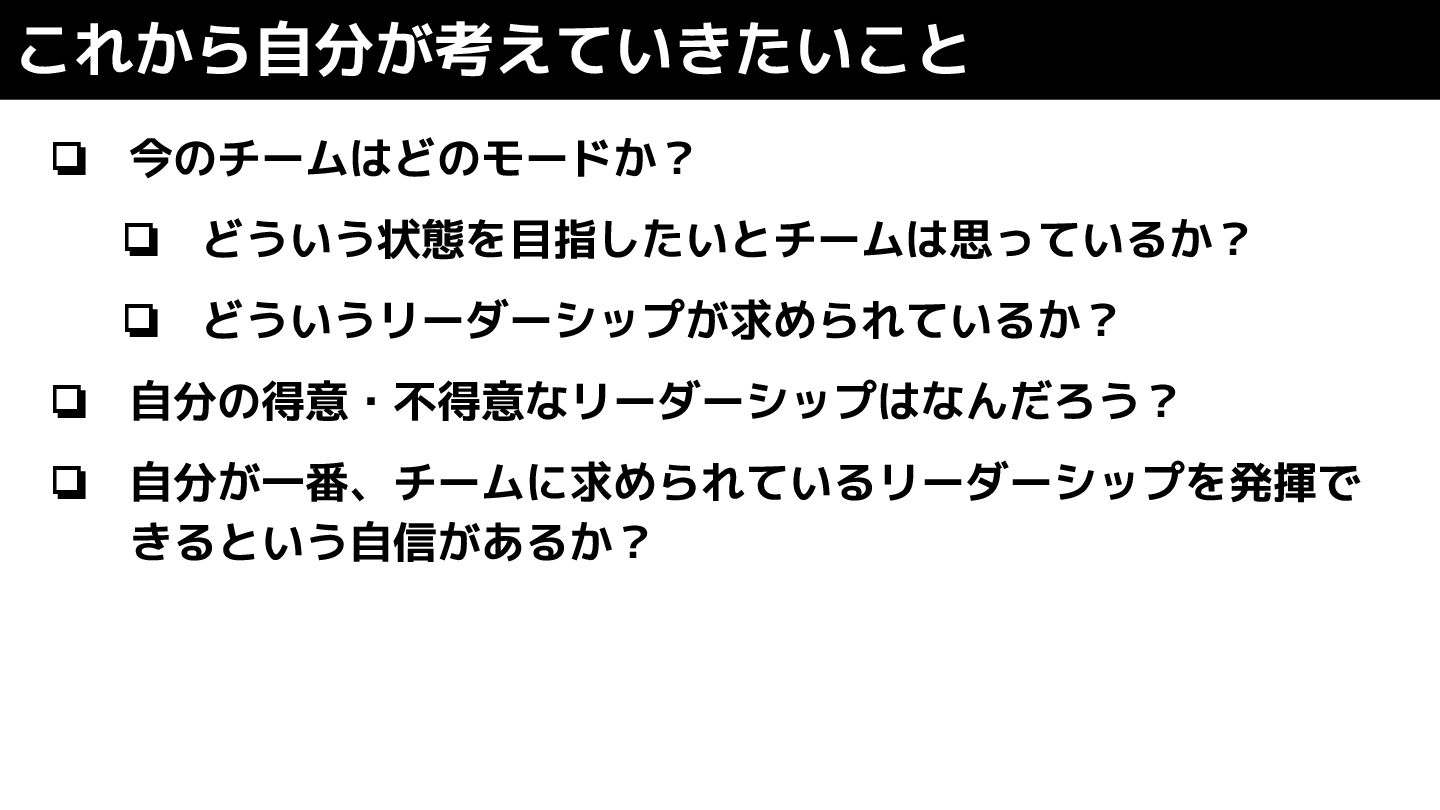 ❏ 今のチームはどのモードか? ❏ どういう状態を目指したいとチームは思っているか? ❏ どういうリーダーシップが求められているか? ❏ 自分の得意・不得意なリーダーシップはなんだろう? ❏ 自分が一番、チームに求められているリーダーシップを発揮で