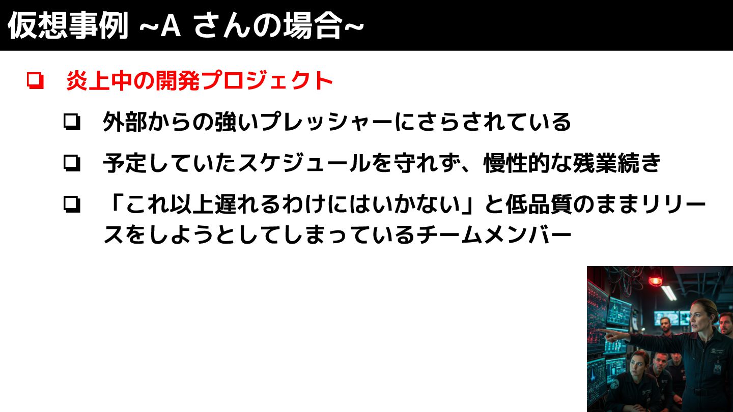 ❏ 炎上中の開発プロジェクト ❏ 外部からの強いプレッシャーにさらされている ❏ 予定していたスケジュールを守れず、慢性的な残業続き ❏ 「これ以上遅れるわけにはいかない」と低品質のままリリー スをしようとしてしまっているチームメンバー 仮想事例
