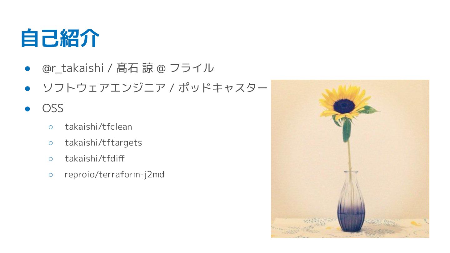 / ポッドキャスター • OSS ◦ takaishi/tfclean ◦ takaishi/tftargets ◦ takaishi/tfdiff ◦ reproio/terraform-j2md
