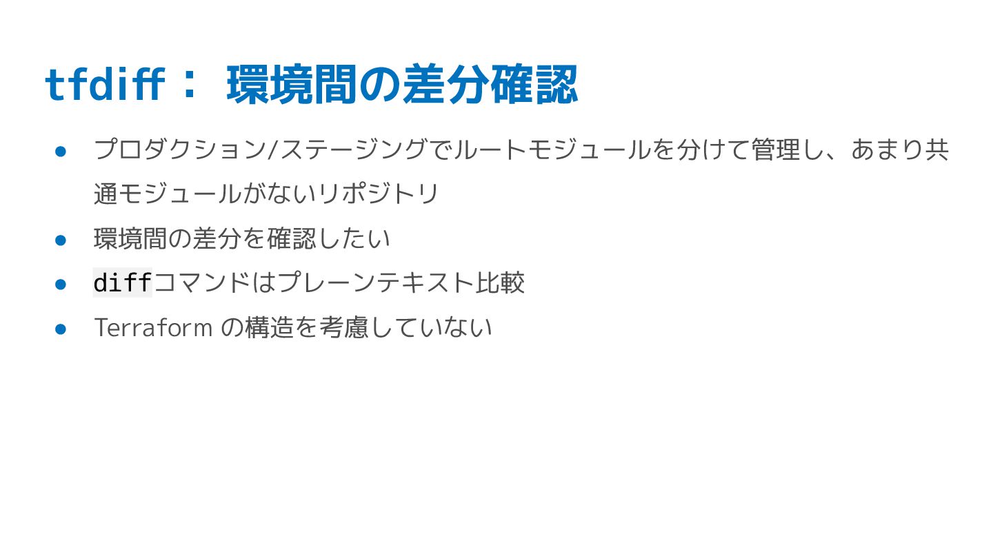 tfdiff: 環境間の差分確認 • プロダクション/ステージングでルートモジュールを分けて管理し、あまり共 通モジュールがないリポジトリ • 環境間の差分を確認したい • diffコマンドはプレーンテキスト比較 •
