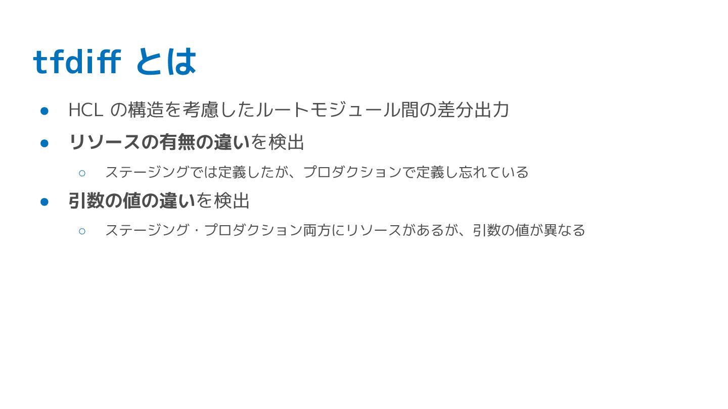 tfdiff とは • HCL の構造を考慮したルートモジュール間の差分出力 • リソースの有無の違いを検出 ◦ ステージングでは定義したが、プロダクションで定義し忘れている •