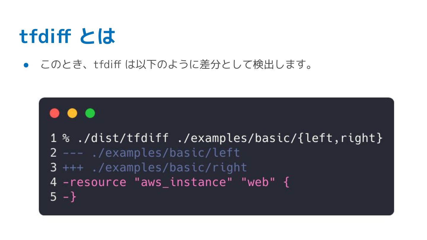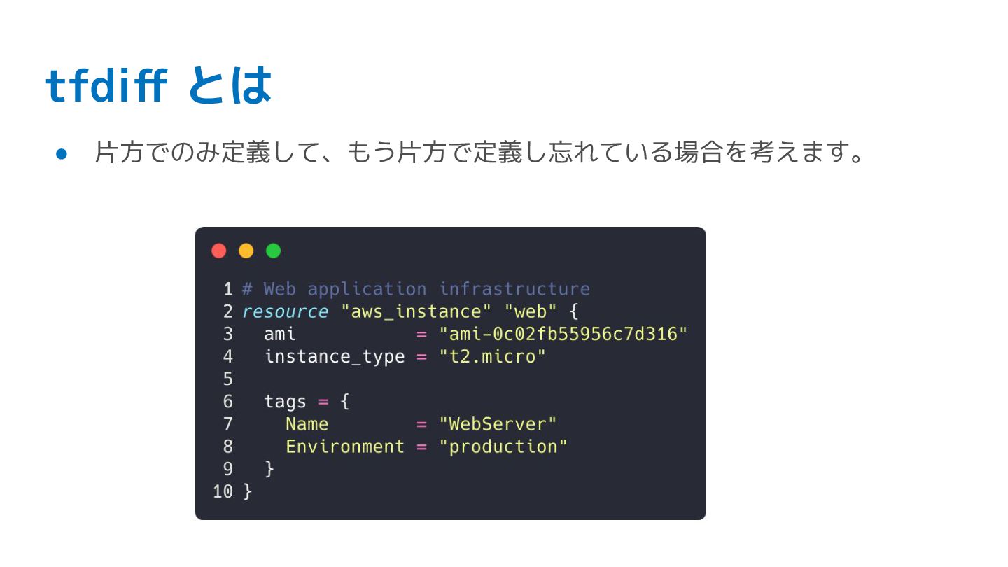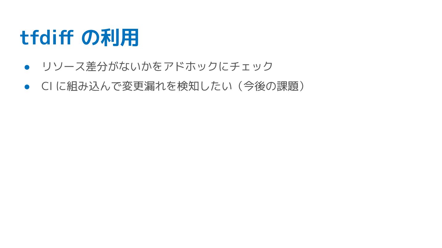 tfdiff の利用 • リソース差分がないかをアドホックにチェック • CI に組み込んで変更漏れを検知したい(今後の課題)
