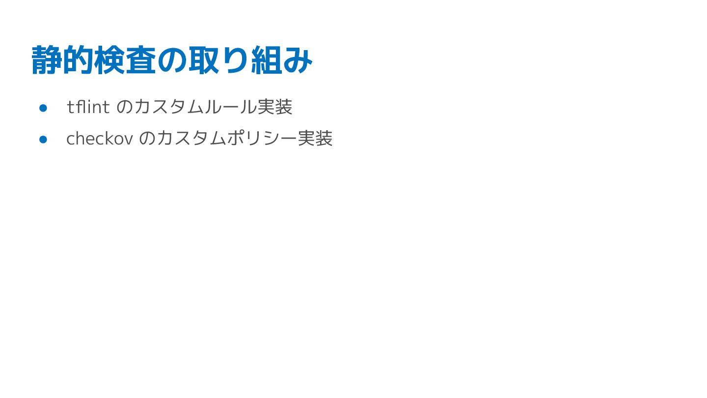 静的検査の取り組み • tflint のカスタムルール実装 • checkov のカスタムポリシー実装