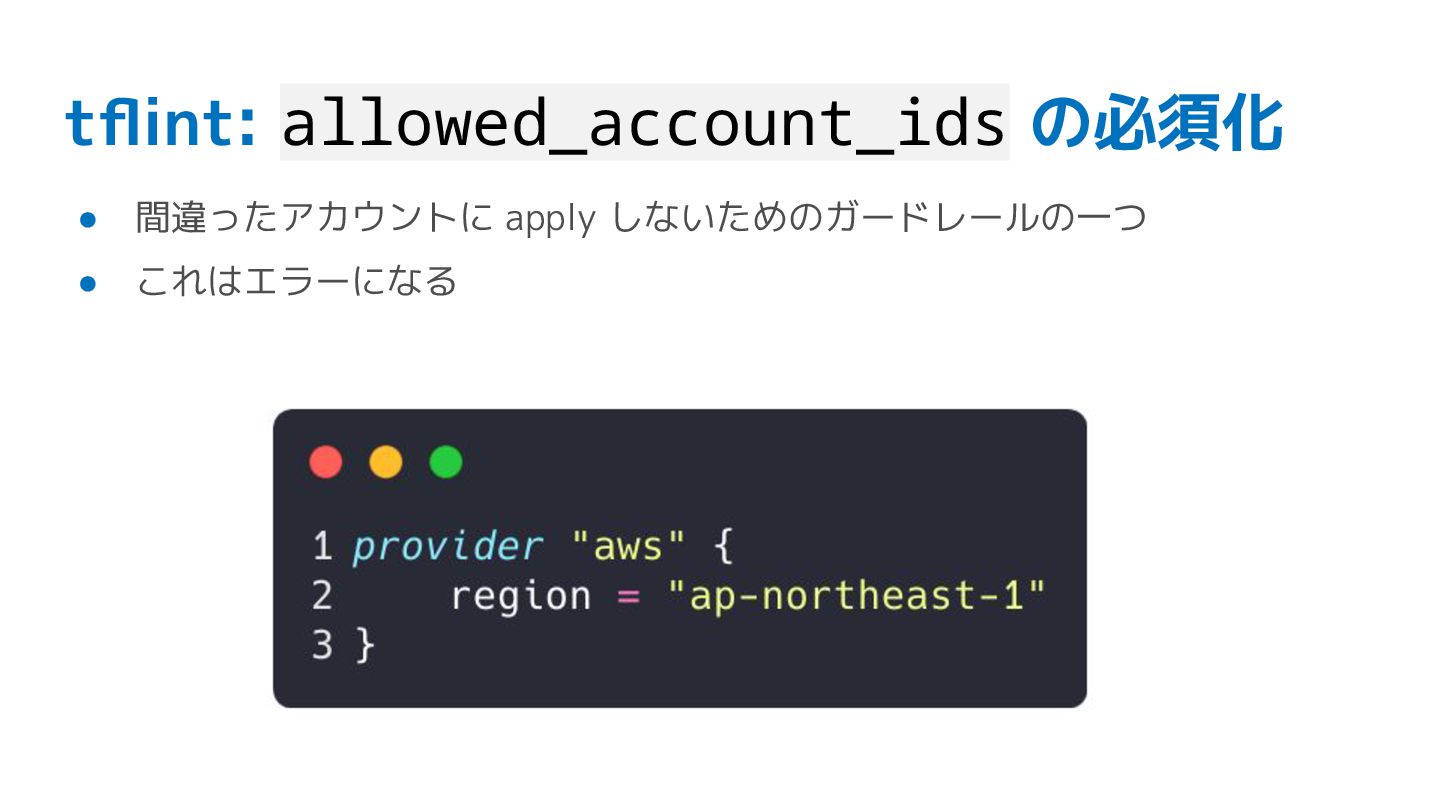 tflint: allowed_account_ids の必須化 • 間違ったアカウントに apply しないためのガードレールの一つ • これはエラーになる