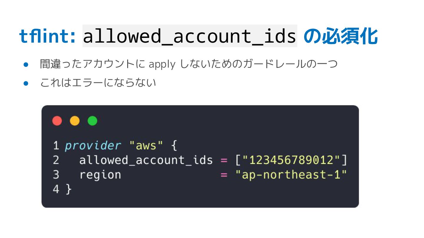 tflint: allowed_account_ids の必須化 • 間違ったアカウントに apply しないためのガードレールの一つ • これはエラーにならない