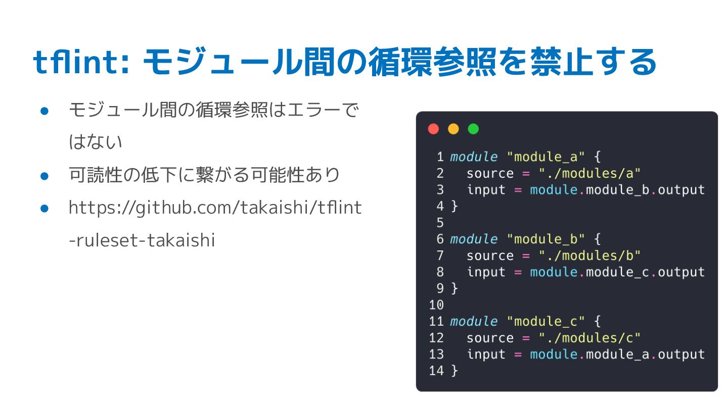 tflint: モジュール間の循環参照を禁止する • モジュール間の循環参照はエラーで はない • 可読性の低下に繋がる可能性あり • https://github.com/takaishi/tflint -ruleset-takaishi
