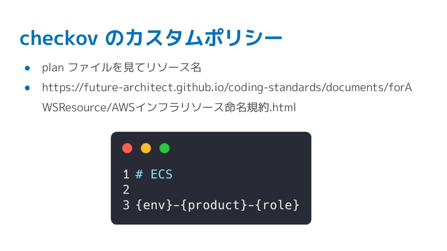 checkov のカスタムポリシー • plan ファイルを見てリソース名が命名規則に従っているか検査 • https://future-architect.github.io/coding-standards/documents/forA WSResource/AWSインフラリソース命名規約.html