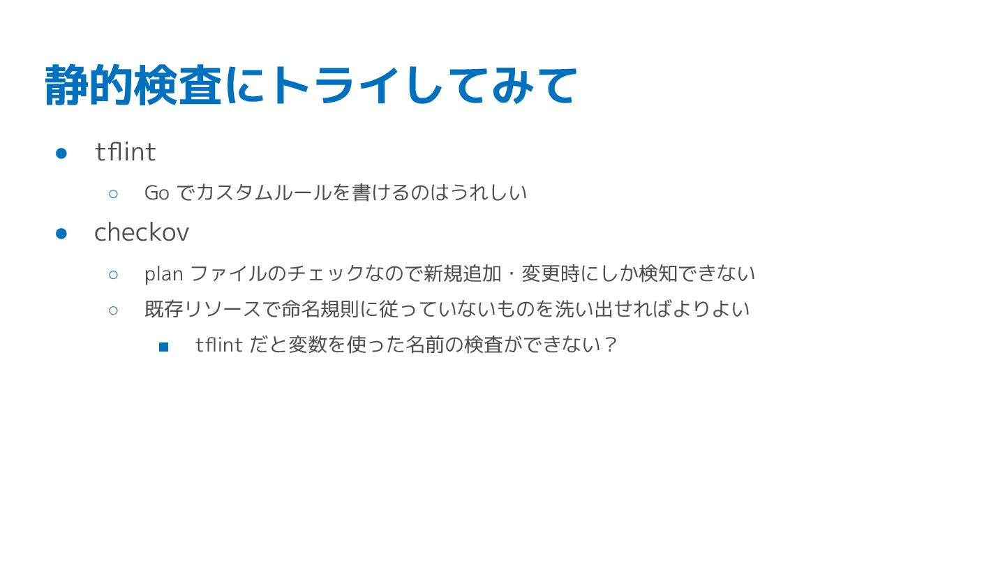 ファイルのチェックなので新規追加・変更時にしか検知できない ◦ 既存リソースで命名規則に従っていないものを洗い出せればよりよい ▪ tflint だと変数を使った名前の検査ができない?