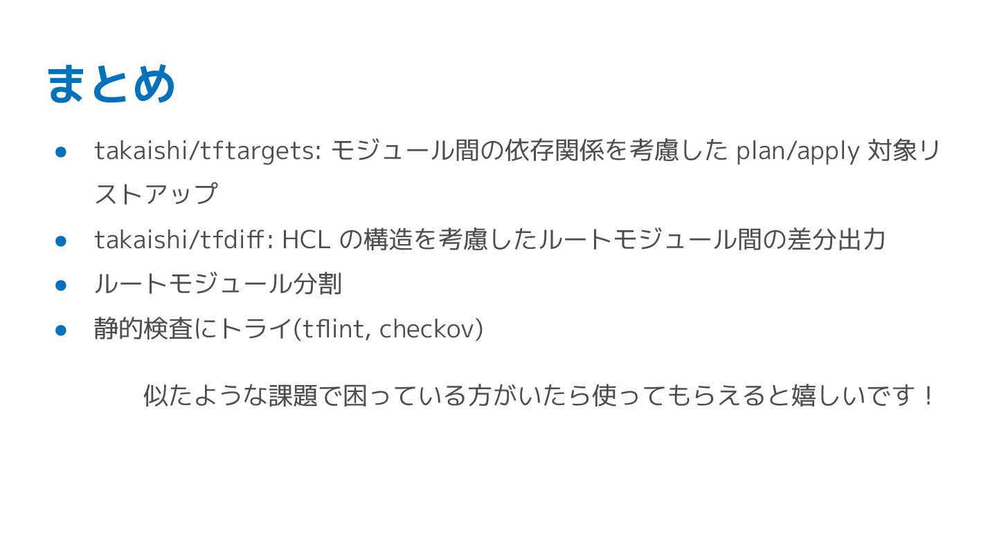 まとめ • takaishi/tftargets: モジュール間の依存関係を考慮した plan/apply 対象リ ストアップ • takaishi/tfdiff: HCL