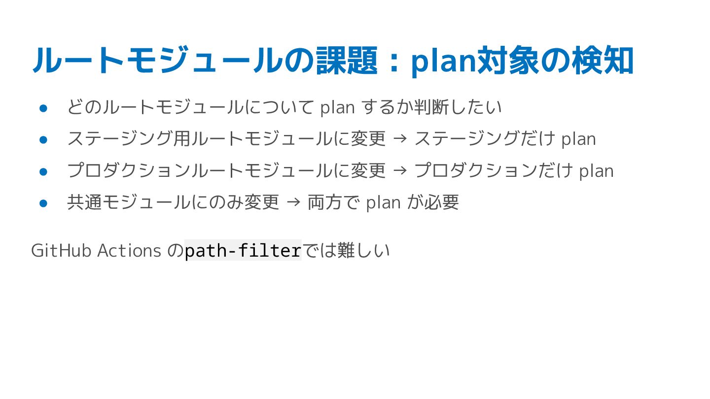 ステージングだけ plan • プロダクションルートモジュールに変更 → プロダクションだけ plan • 共通モジュールにのみ変更 → 両方で plan が必要 GitHub Actions のpath-filterでは難しい