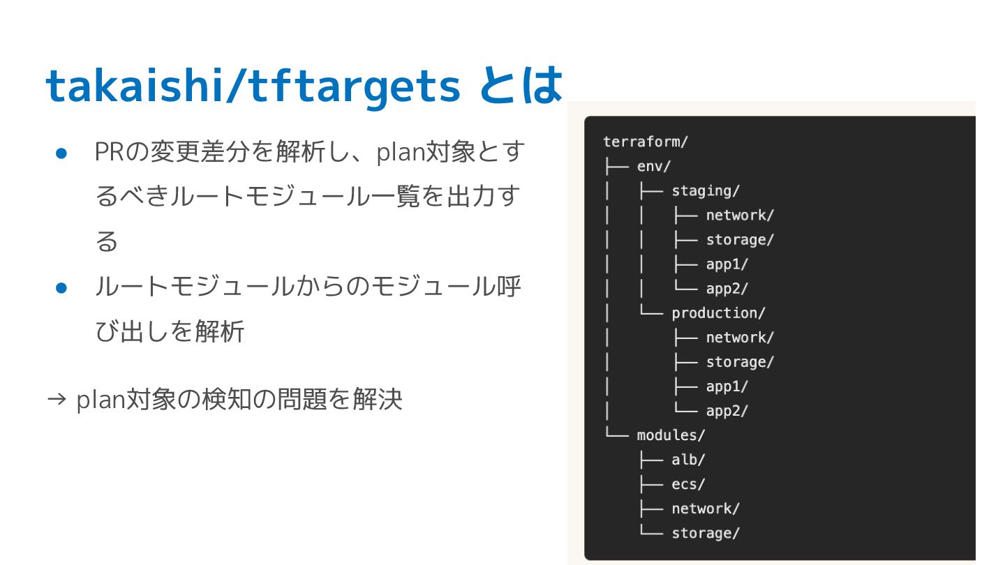 takaishi/tftargets とは • PRの変更差分を解析し、plan対象とす るべきルートモジュール一覧を出力す る • ルートモジュールからのモジュール呼 び出しを解析 →