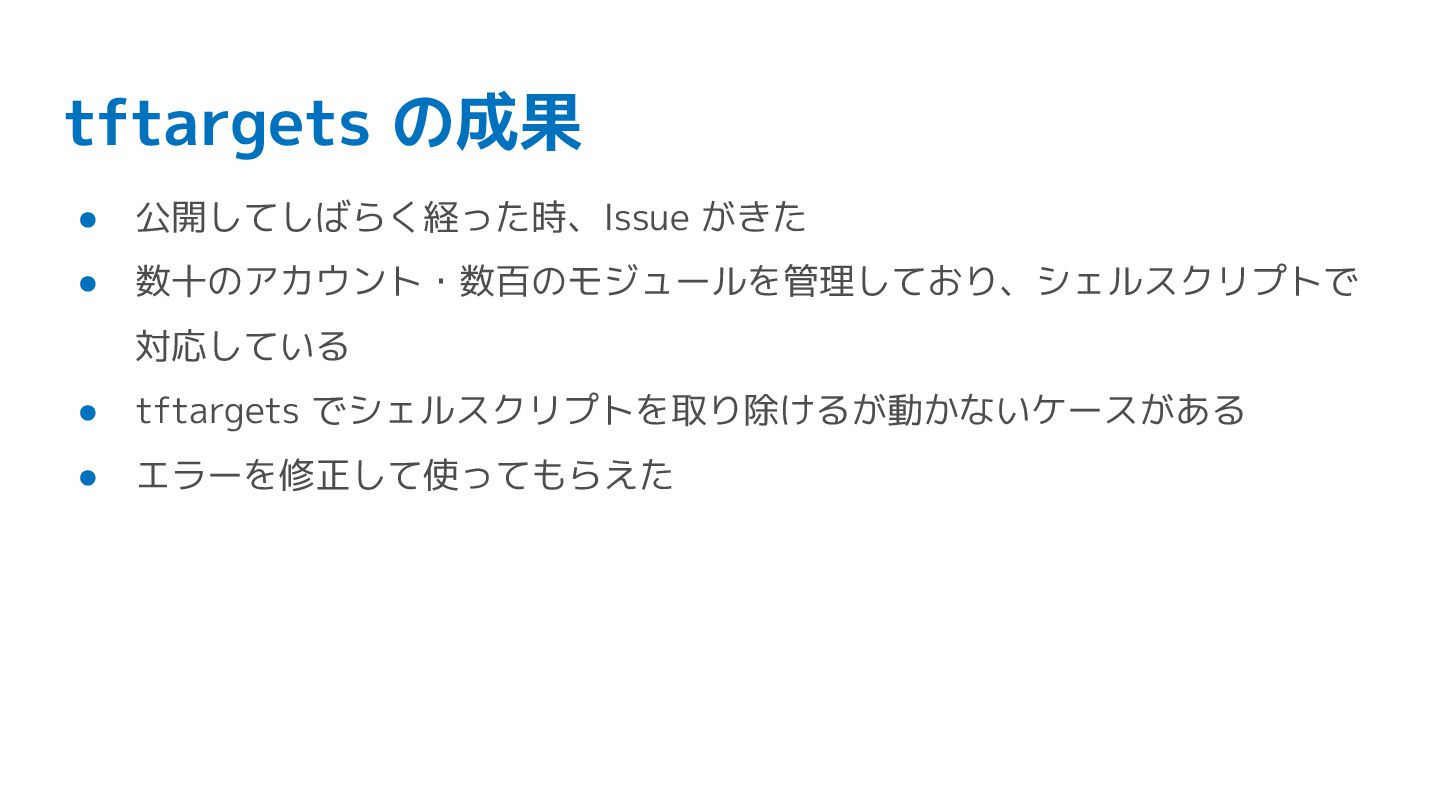 tftargets の成果 • 公開してしばらく経った時、Issue がきた • 数十のアカウント・数百のモジュールを管理しており、シェルスクリプトで 対応している • tftargets
