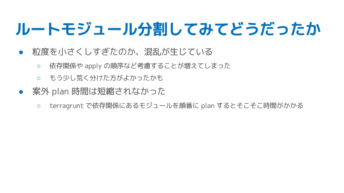 ルートモジュール分割してみてどうだったか • 粒度を小さくしすぎたのか、混乱が生じている ◦ 依存関係や apply の順序など考慮することが増えてしまった ◦ もう少し荒く分けた方がよかったかも •