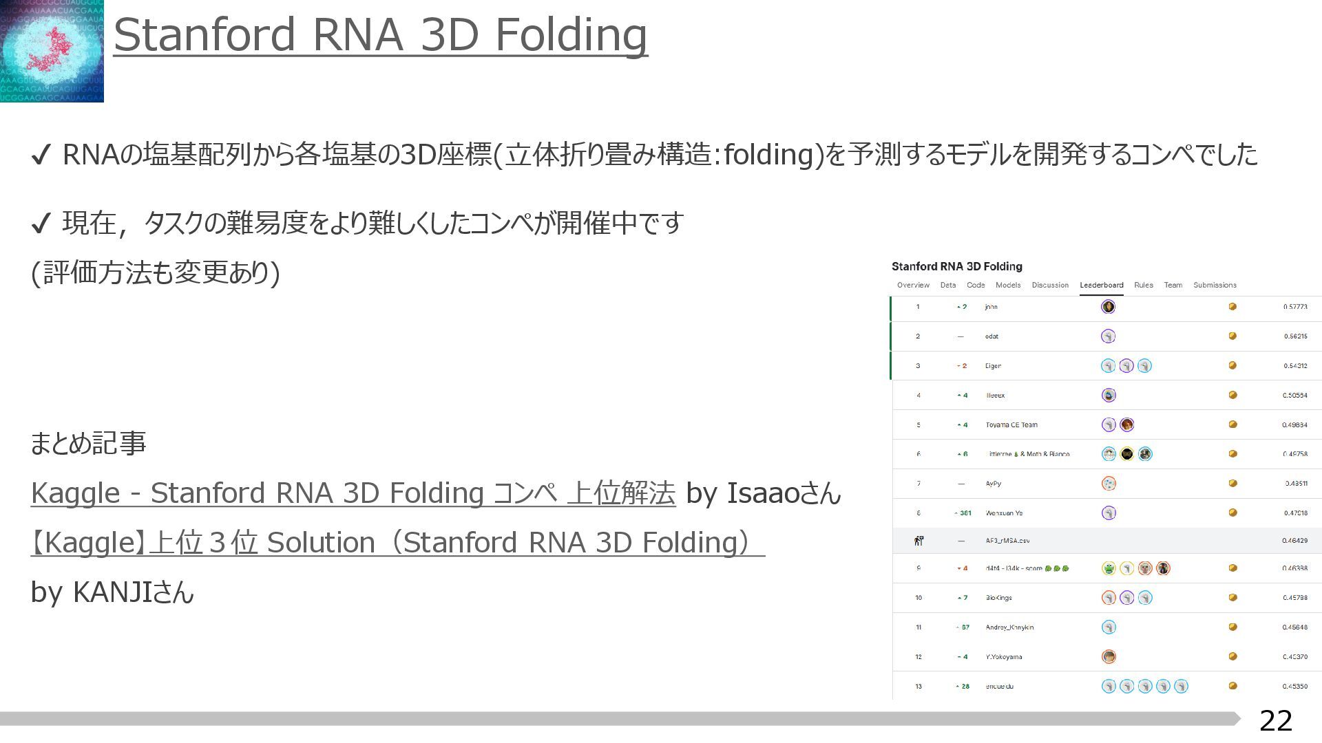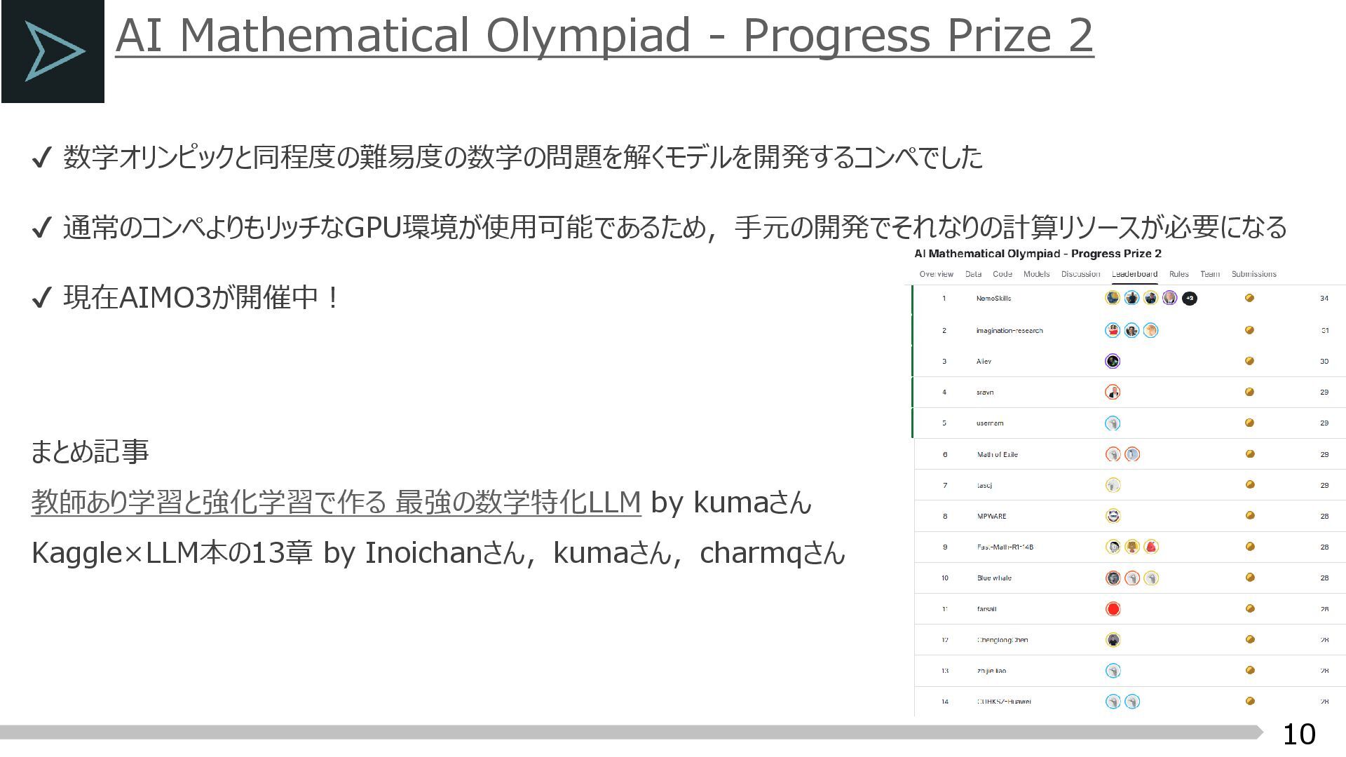 ✔ 通常のコンペよりもリッチなGPU環境が使用可能であるため,手元の開発でそれなりの計算リソースが必要になる ✔ 現在AIMO3が開催中! まとめ記事 教師あり学習と強化学習で作る 最強の数学特化LLM by kumaさん Kaggle×LLM本の13章 by Inoichanさん,kumaさん,charmqさん
