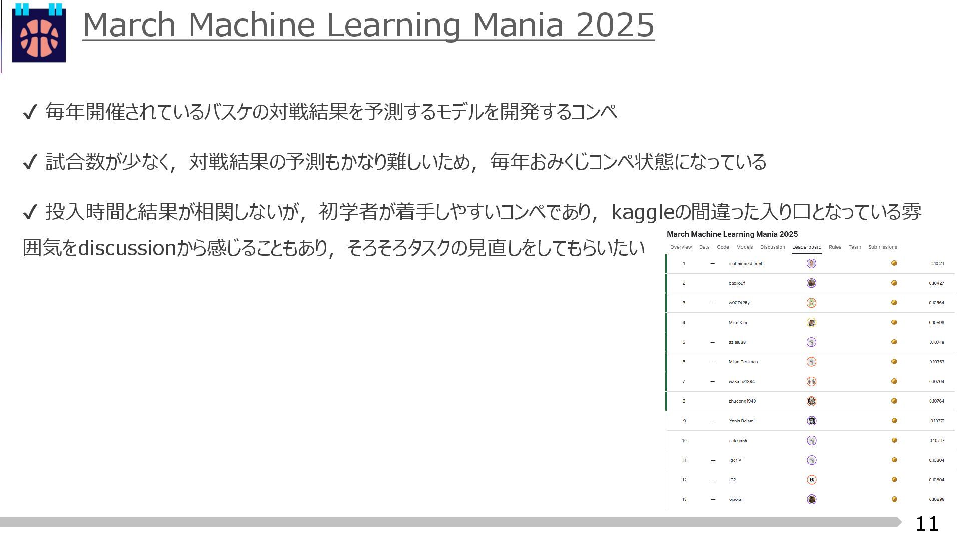11. 11 March Machine Learning Mania 2025 ✔ 毎年開催されているバスケの対戦結果を予測するモデルを開発するコンペ ✔ 試合数が少なく,対戦結果の予測もかなり難しいため,毎年おみくじコンペ状態になっている