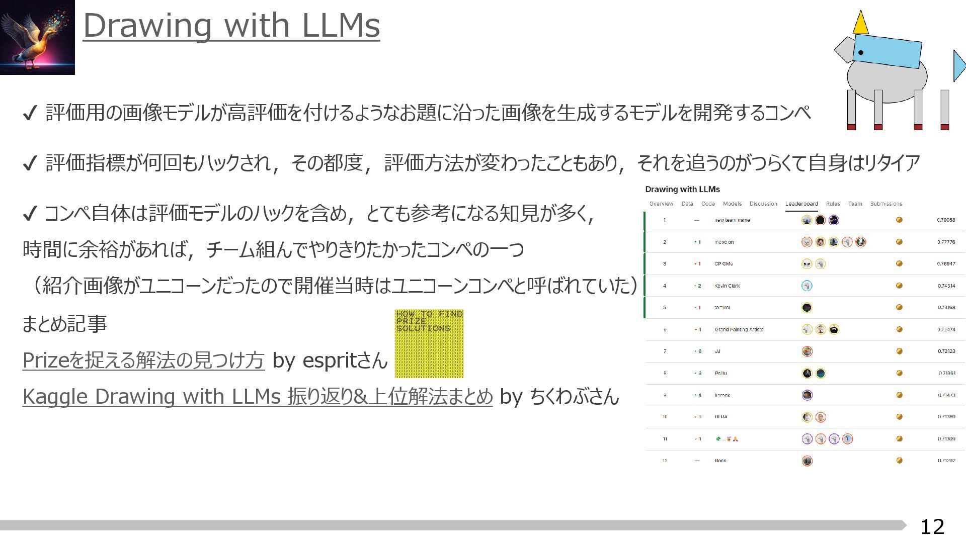 12. 12 Drawing with LLMs ✔ 評価用の画像モデルが高評価を付けるようなお題に沿った画像を生成するモデルを開発するコンペ ✔ 評価指標が何回もハックされ,その都度,評価方法が変わったこともあり,それを追うのがつらくて自身はリタイア ✔ コンペ自体は評価モデルのハックを含め,とても参考になる知見が多く,