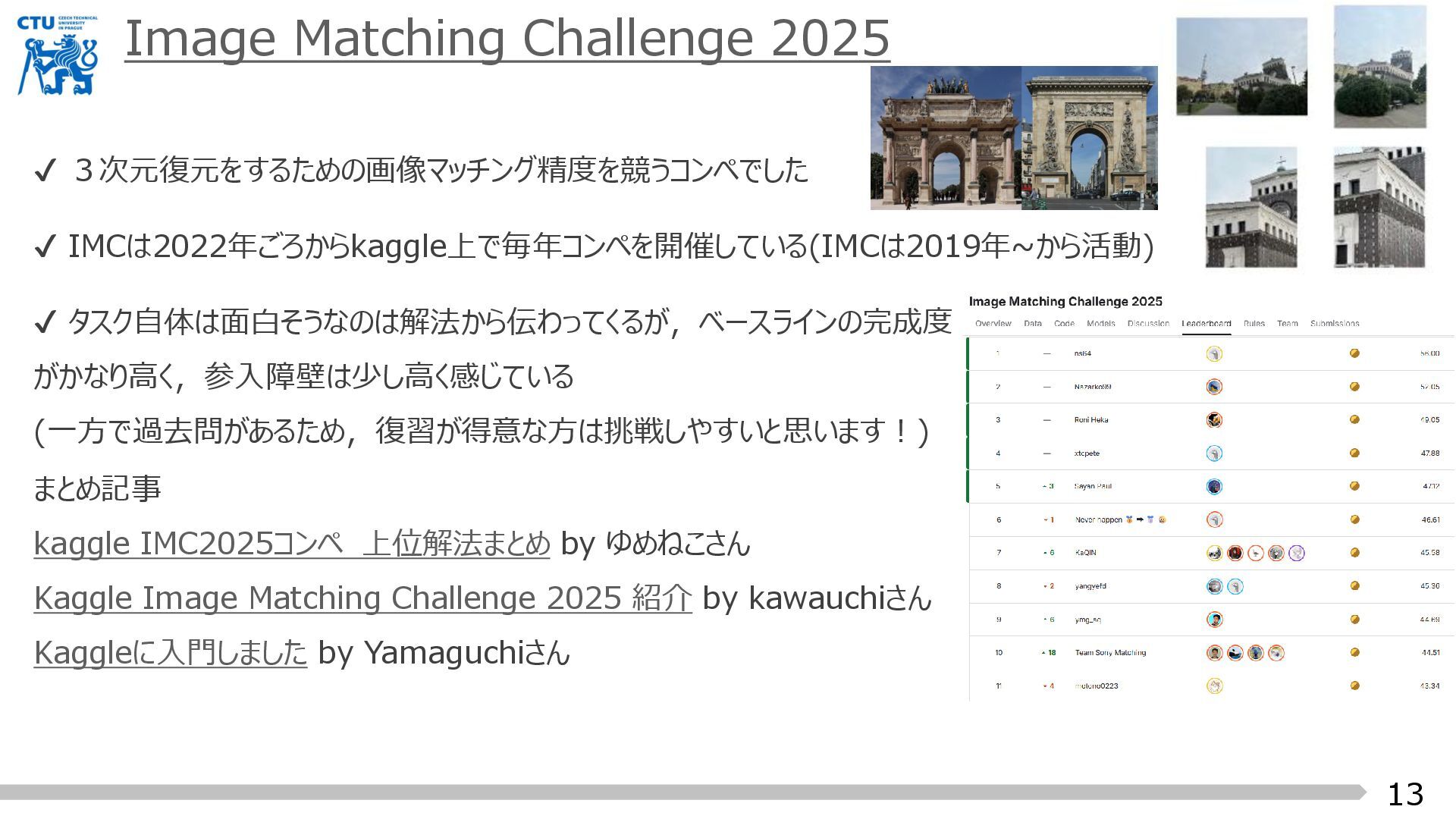 13. 13 Image Matching Challenge 2025 ✔ 3次元復元をするための画像マッチング精度を競うコンペでした ✔ IMCは2022年ごろからkaggle上で毎年コンペを開催している(IMCは2019年~から活動) ✔