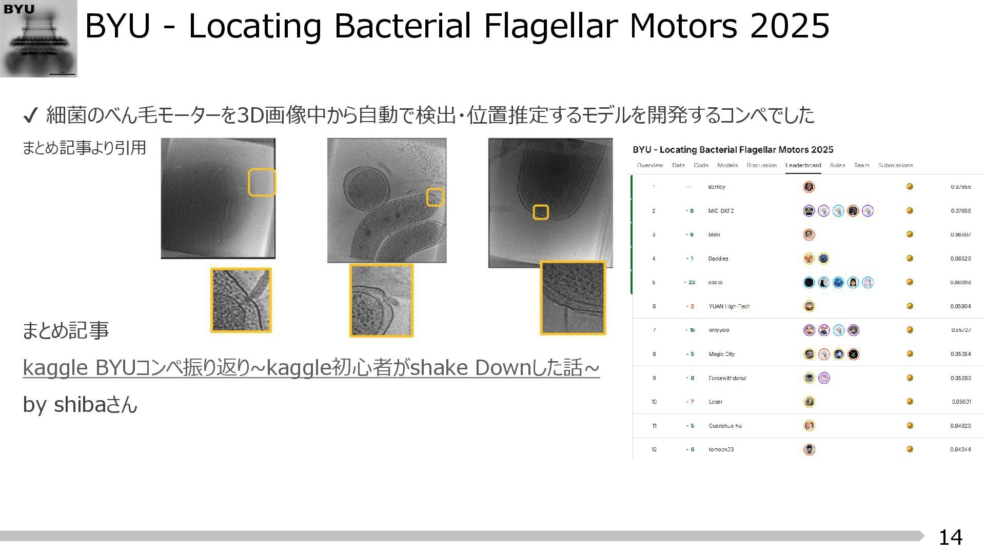 14. 14 BYU - Locating Bacterial Flagellar Motors 2025 ✔ 細菌のべん毛モーターを3D画像中から自動で検出・位置推定するモデルを開発するコンペでした