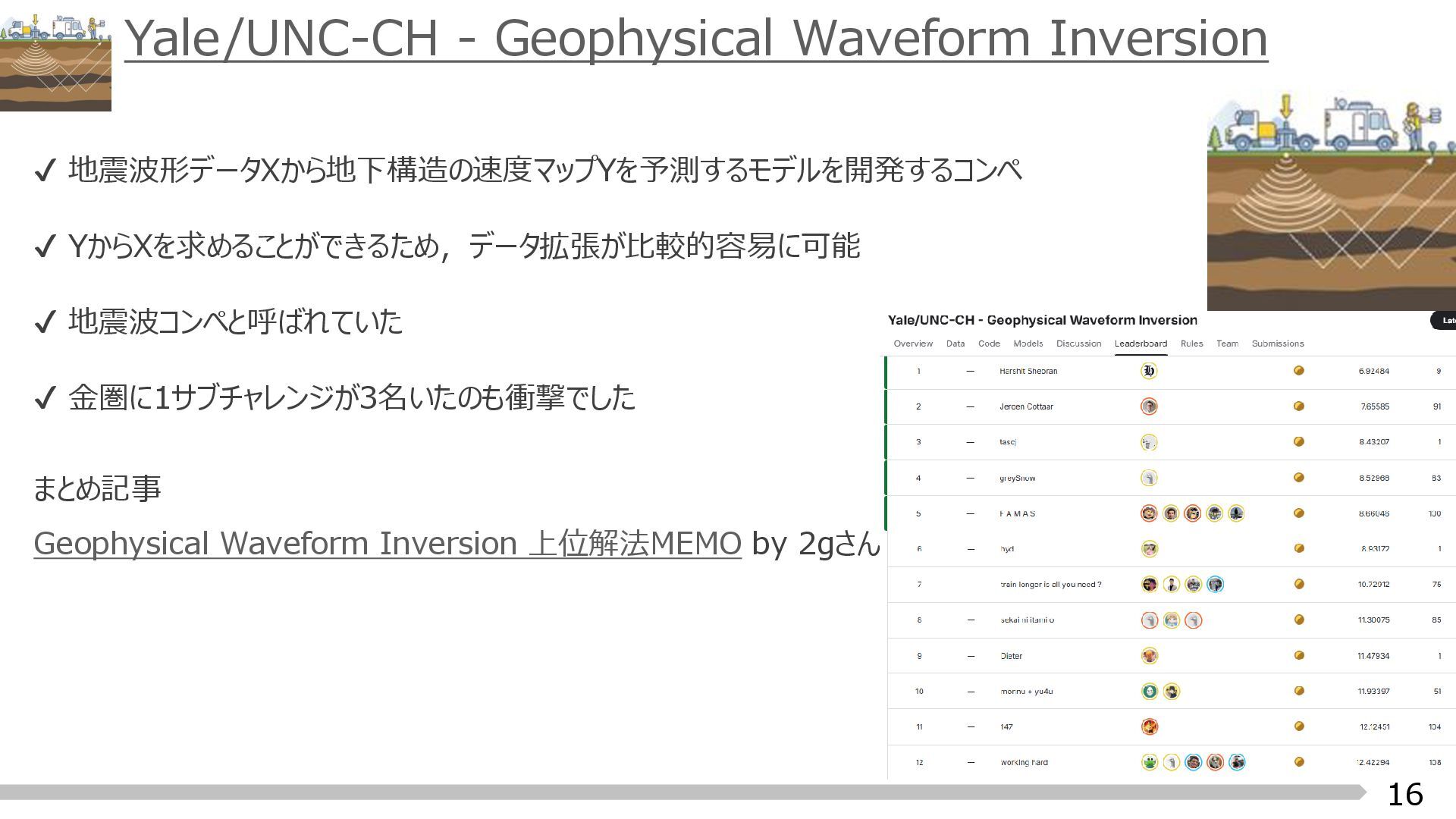 ✔ 地震波コンペと呼ばれていた ✔ 金圏に1サブチャレンジが3名いたのも衝撃でした まとめ記事 Geophysical Waveform Inversion 上位解法MEMO by 2gさん