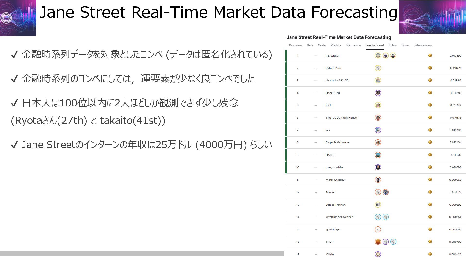 ✔ 金融時系列のコンペにしては,運要素が少なく良コンペでした ✔ 日本人は100位以内に2人ほどしか観測できず少し残念 (Ryotaさん(27th) と takaito(41st)) ✔ Jane Streetのインターンの年収は25万ドル (4000万円) らしい