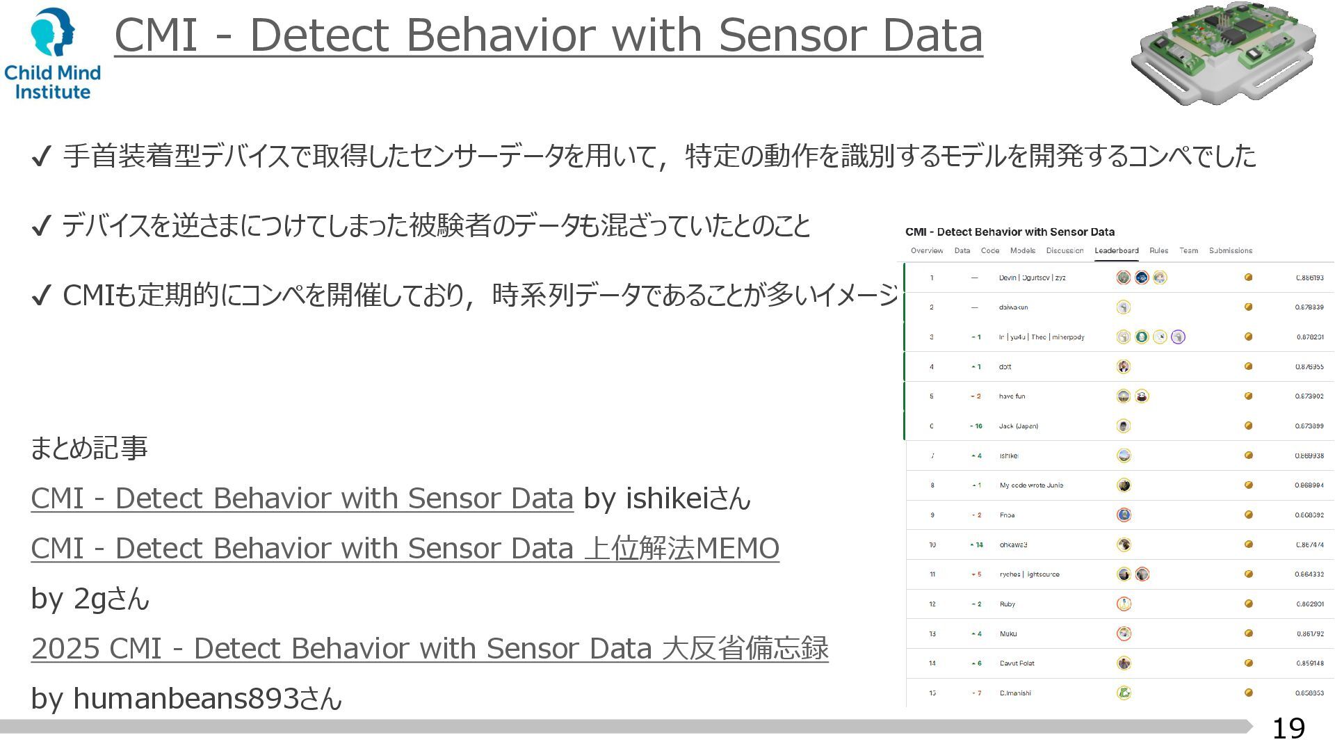 ✔ デバイスを逆さまにつけてしまった被験者のデータも混ざっていたとのこと ✔ CMIも定期的にコンペを開催しており,時系列データであることが多いイメージ まとめ記事 CMI - Detect Behavior with Sensor Data by ishikeiさん CMI - Detect Behavior with Sensor Data 上位解法MEMO by 2gさん 2025 CMI - Detect Behavior with Sensor Data 大反省備忘録 by humanbeans893さん