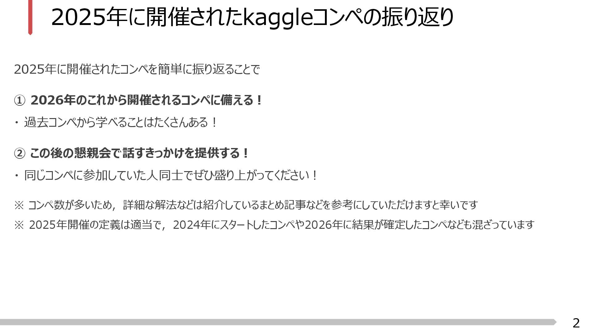 2. 2 2025年に開催されたkaggleコンペの振り返り 2025年に開催されたコンペを簡単に振り返ることで ① 2026年のこれから開催されるコンペに備える! ・ 過去コンペから学べることはたくさんある! ② この後の懇親会で話すきっかけを提供する! ・