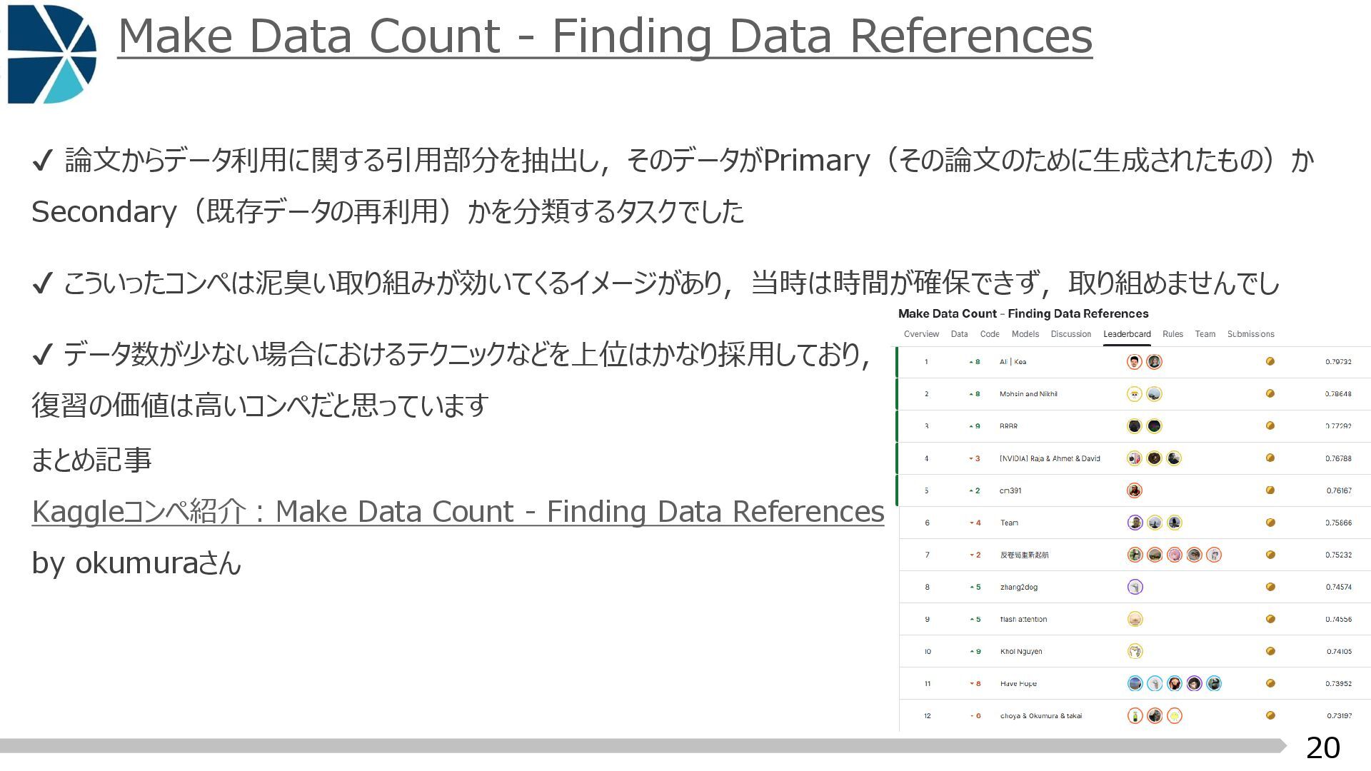 18. 20 Make Data Count - Finding Data References ✔ 論文からデータ利用に関する引用部分を抽出し,そのデータがPrimary(その論文のために生成されたもの)か