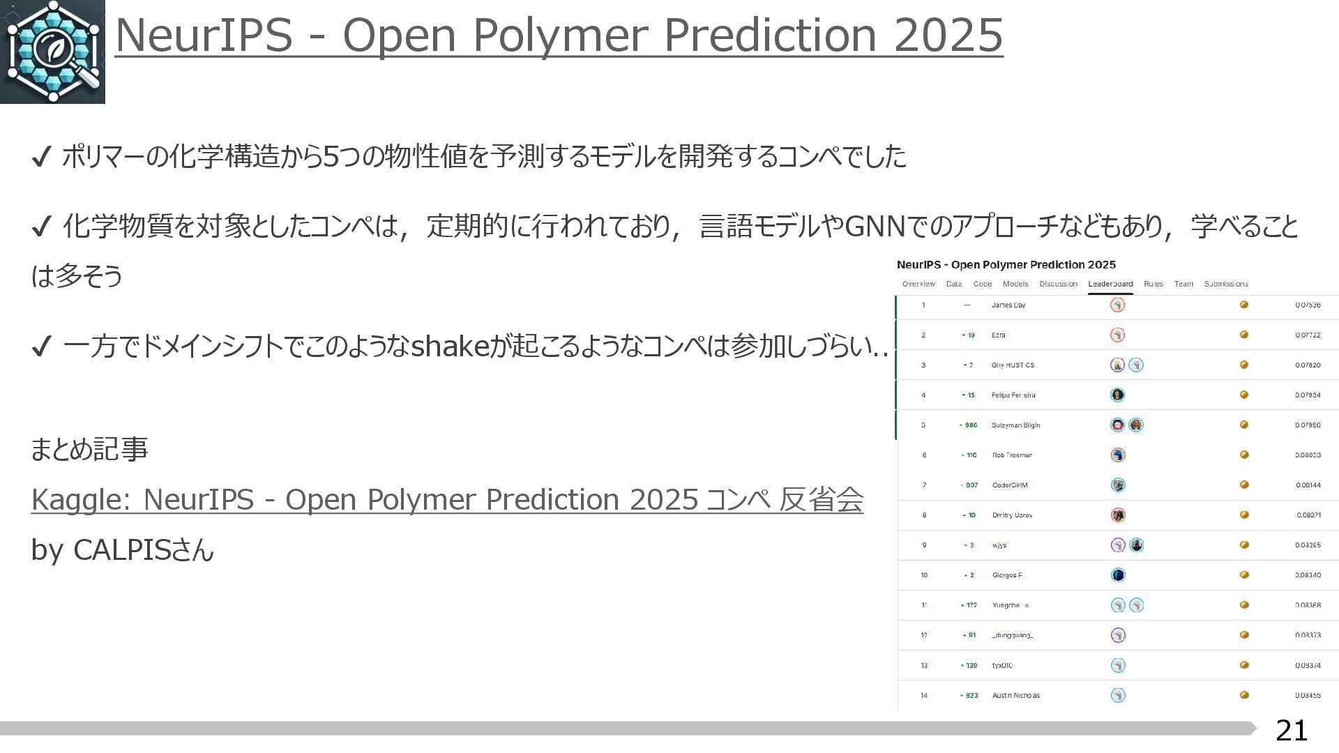 19. 21 NeurIPS - Open Polymer Prediction 2025 ✔ ポリマーの化学構造から5つの物性値を予測するモデルを開発するコンペでした ✔