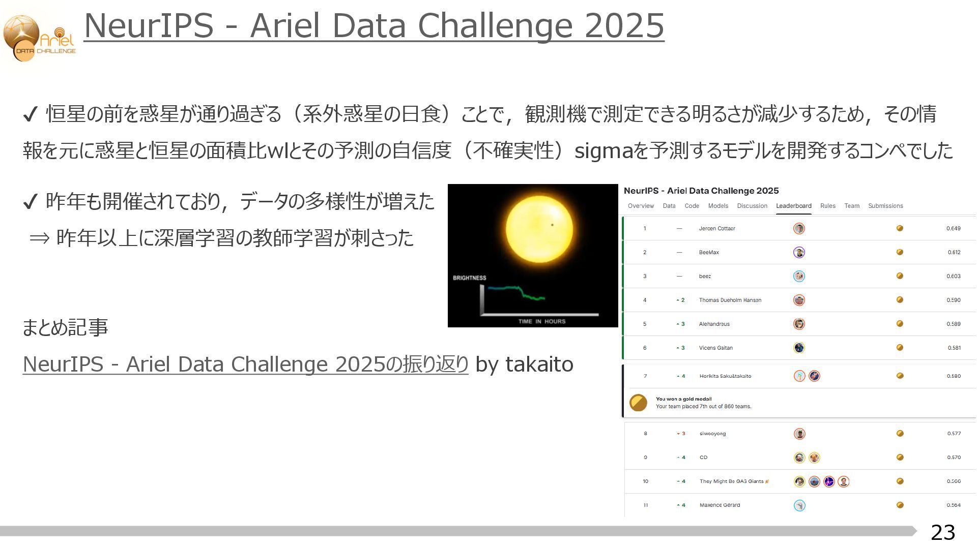 同じコンペに参加していた人同士でぜひ盛り上がってください! ※ コンペ数が多いため,詳細な解法などは紹介しているまとめ記事などを参考にしていただけますと幸いです ※ 2025年開催の定義は適当で,2024年にスタートしたコンペや2026年に結果が確定したコンペなども混ざっています