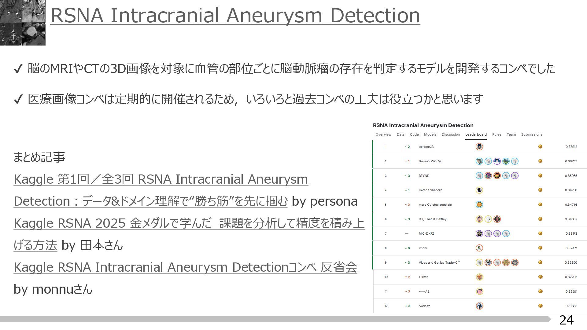 Kaggle 第1回/全3回 RSNA Intracranial Aneurysm Detection:データ&ドメイン理解で“勝ち筋”を先に掴む by persona Kaggle RSNA 2025 金メダルで学んだ 課題を分析して精度を積み上 げる方法 by 田本さん Kaggle RSNA Intracranial Aneurysm Detectionコンペ 反省会 by monnuさん