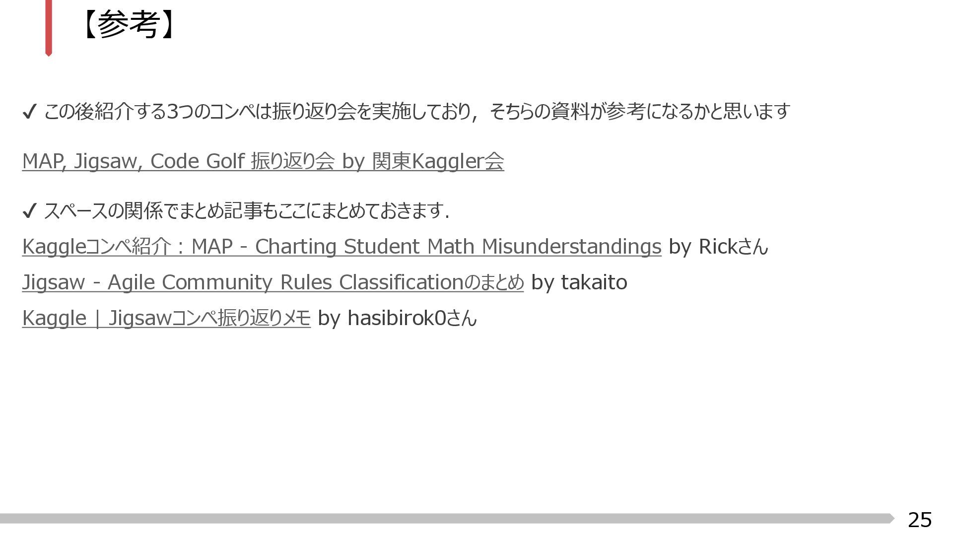 21. 25 【参考】 ✔ この後紹介する3つのコンペは振り返り会を実施しており,そちらの資料が参考になるかと思います MAP, Jigsaw, Code Golf 振り返り会 by