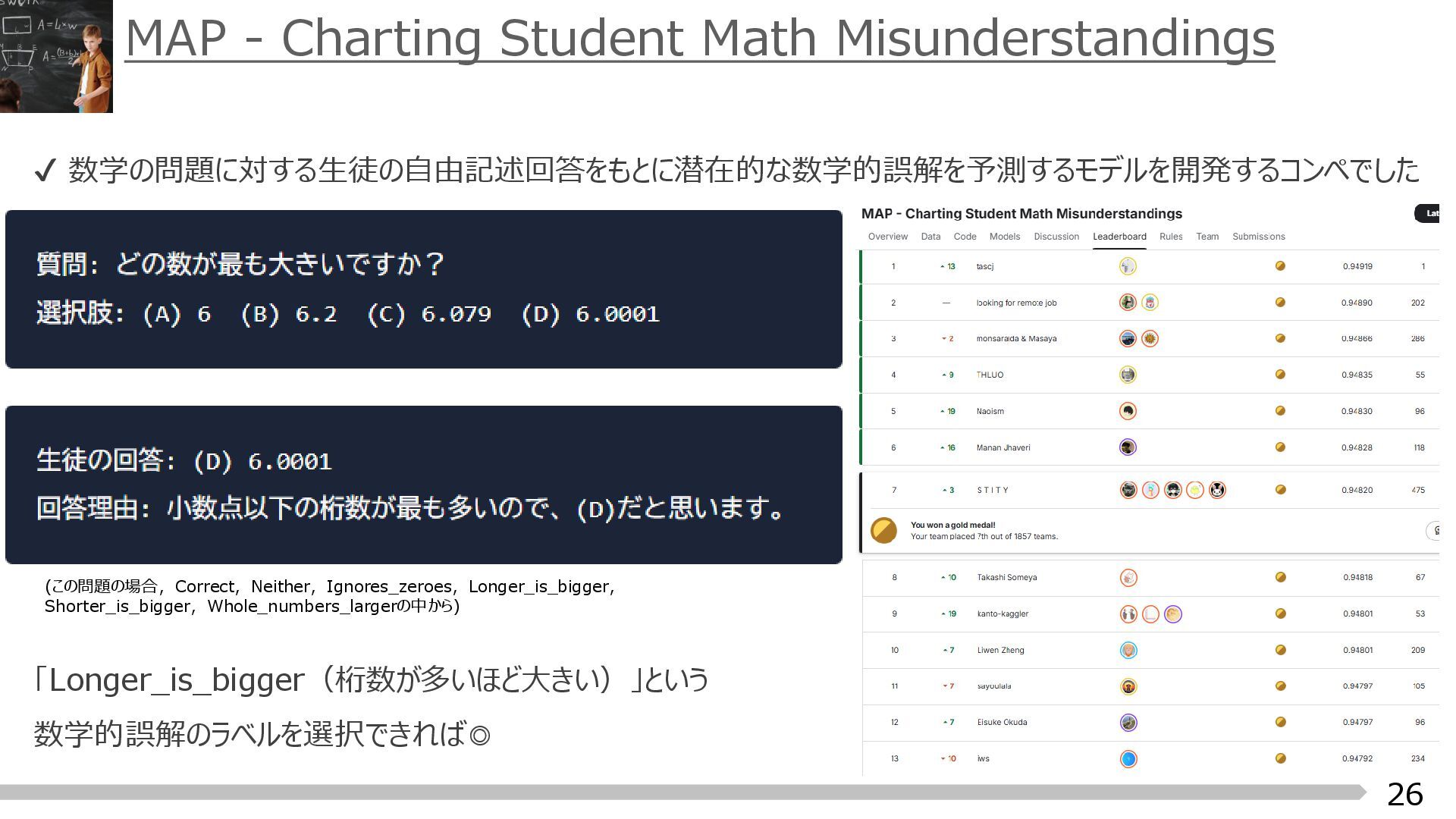 22. 26 MAP - Charting Student Math Misunderstandings ✔ 数学の問題に対する生徒の自由記述回答をもとに潜在的な数学的誤解を予測するモデルを開発するコンペでした 「Longer_is_bigger(桁数が多いほど大きい)」という