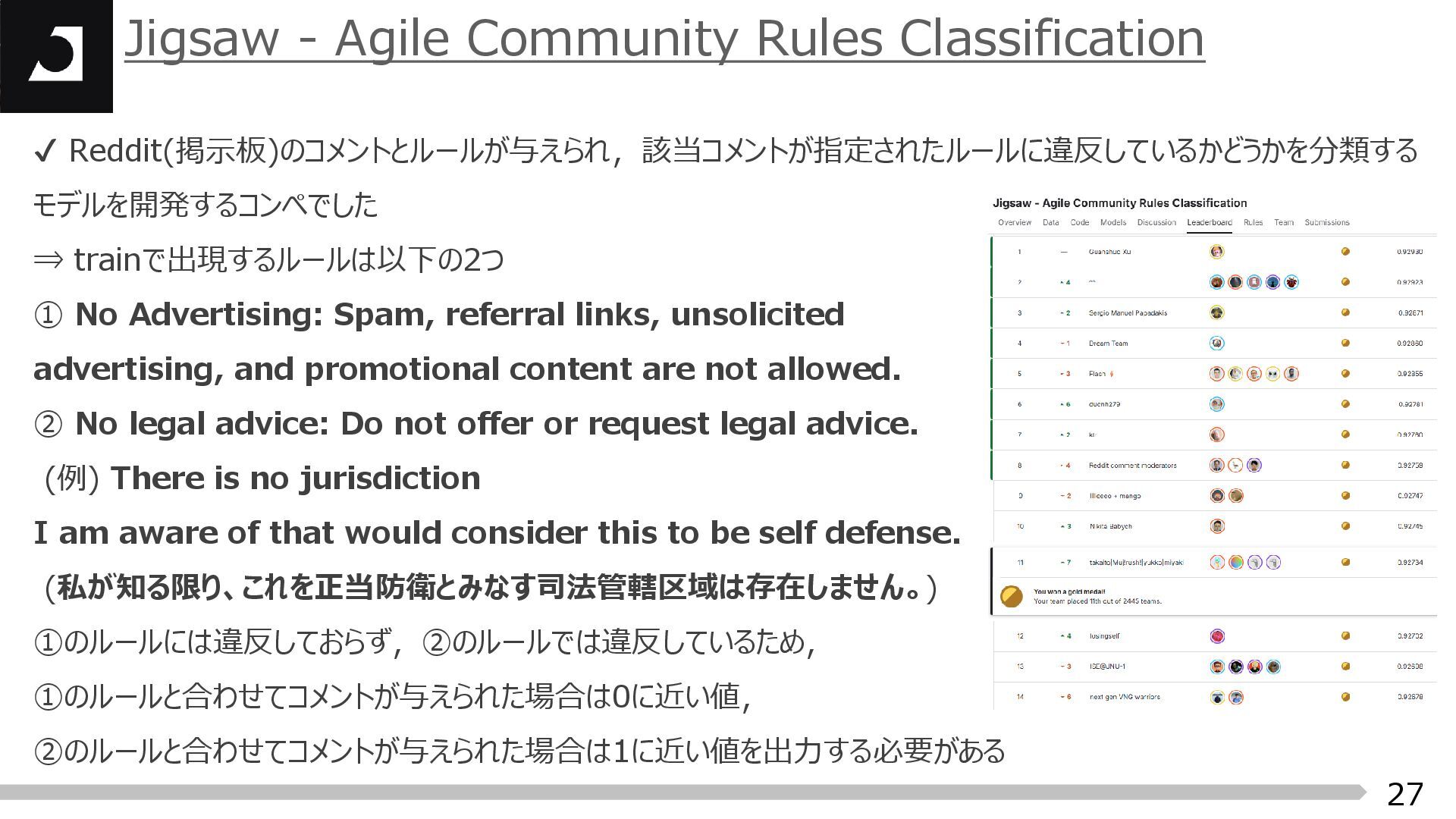 23. 27 Jigsaw - Agile Community Rules Classification ✔ Reddit(掲示板)のコメントとルールが与えられ,該当コメントが指定されたルールに違反しているかどうかを分類する モデルを開発するコンペでした