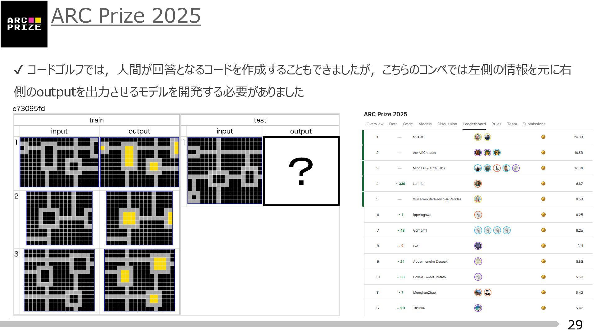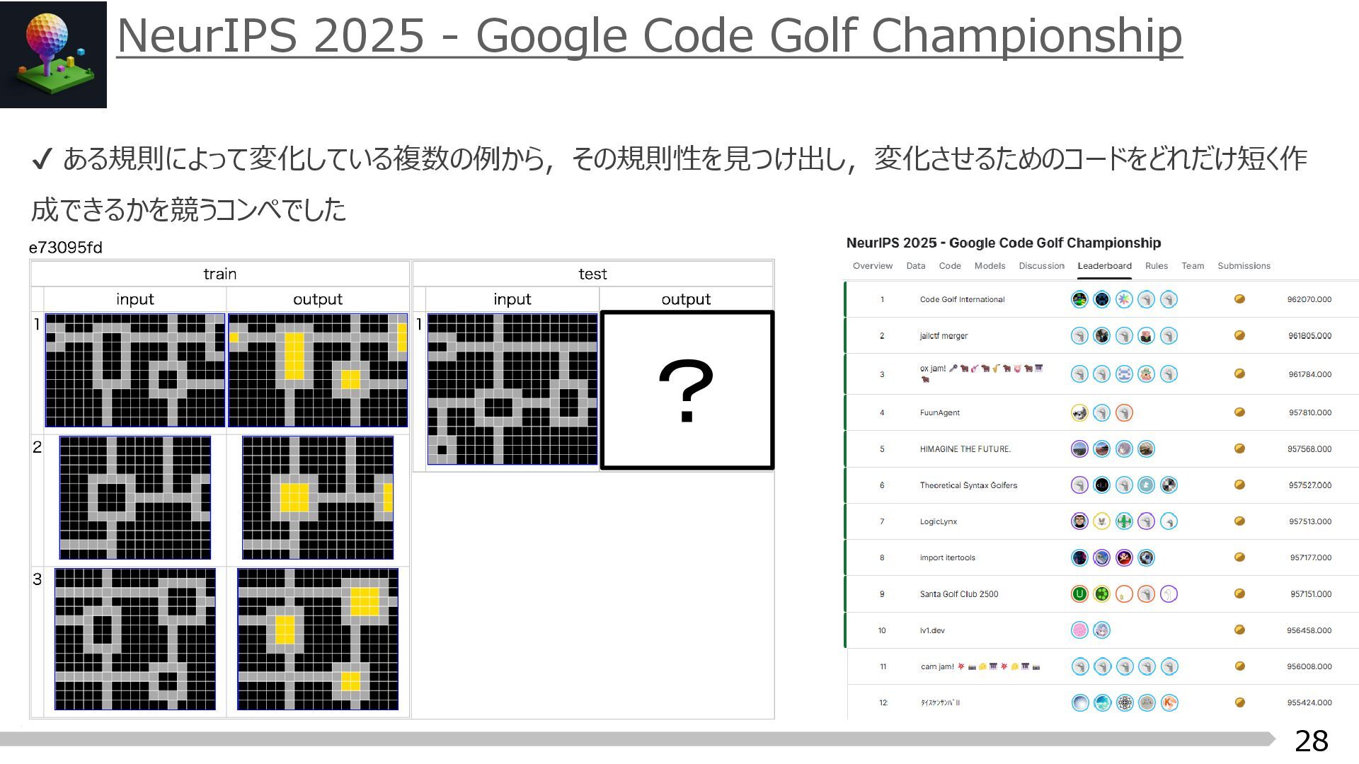 を作成し,そのプロンプトの有効性を競うコンペでした ✔ Kaggleでも似たようなコンペはありましたが,あくまでテストデータの入力に対してモデルを用いてプロンプトを生成す ることが求められていましたが,こちらのコンペでは人手でプロンプトを作成することも可能であり,プロンプトのみを提出 すればよいため,参加ハードルが低く設定されていて感動しました ✔ 技術としても非常に重要なテーマであり,大変参考になりました