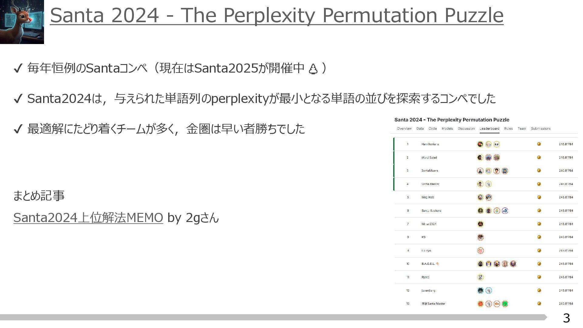 3. 3 Santa 2024 - The Perplexity Permutation Puzzle ✔ 毎年恒例のSantaコンペ(現在はSanta2025が開催中🌲)