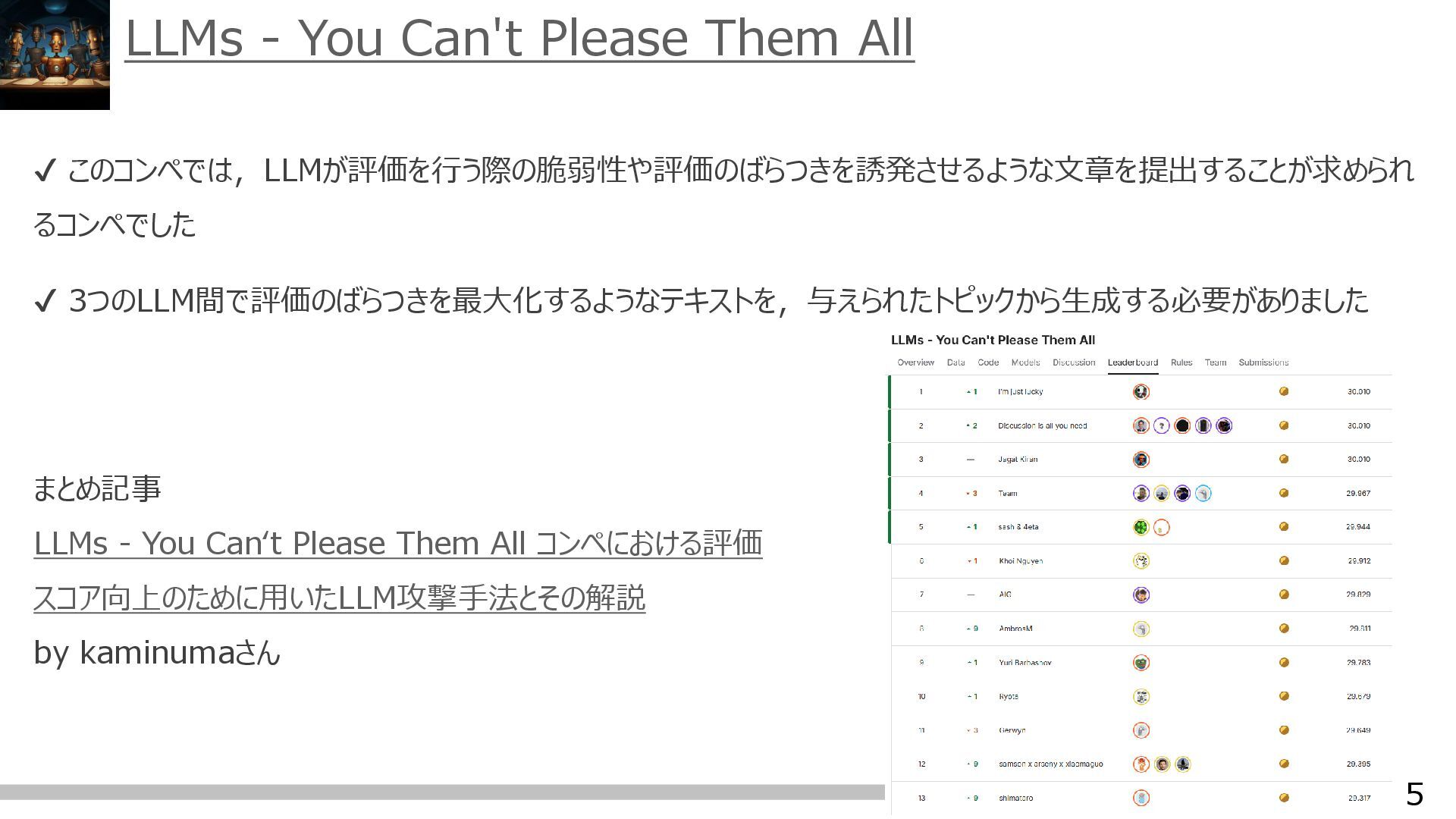 5. 5 LLMs - You Can't Please Them All ✔ このコンペでは,LLMが評価を行う際の脆弱性や評価のばらつきを誘発させるような文章を提出することが求められ